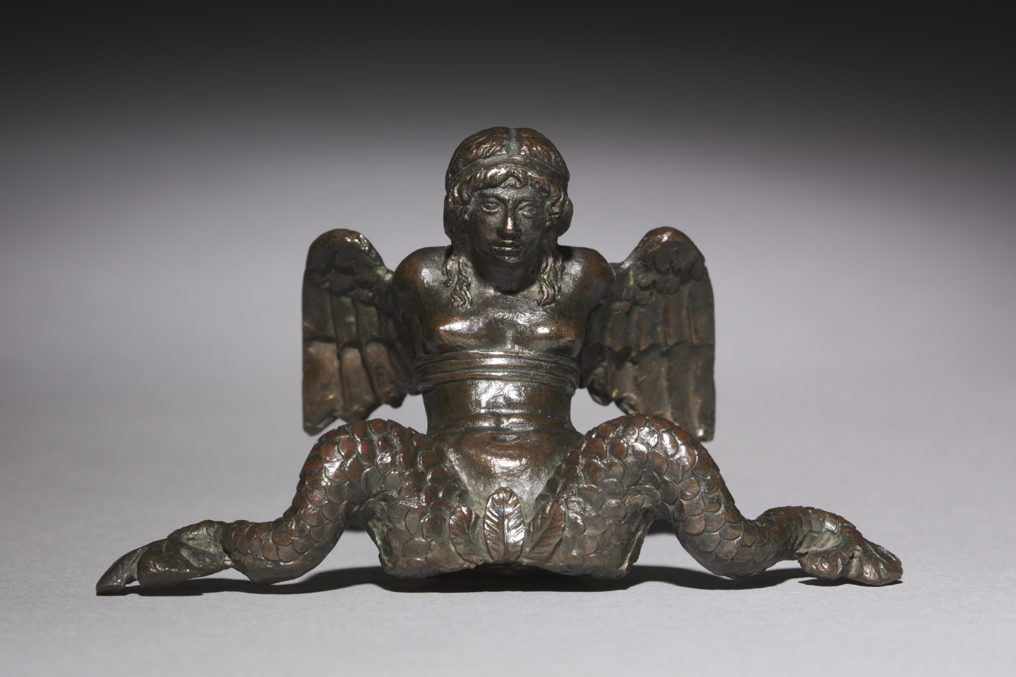 The sculpture "Doorpull" by Leone Leoni depicts a bronze figure of a mythical creature, possibly a harpy or sphinx, with a human-like upper body and a lower body resembling a fish or serpent. The figure has wings protruding from its back and appears to be sitting with its legs splayed out to the sides. The creature's upper body is bare, with defined muscles and a headband around its forehead. Its facial features are detailed, with a nose, mouth, and eyes visible. The lower body is covered in scales, and the wings are feathered. The sculpture has a dark brown patina and sits on a plain background that gradates from light gray at the bottom to dark gray at the top.
