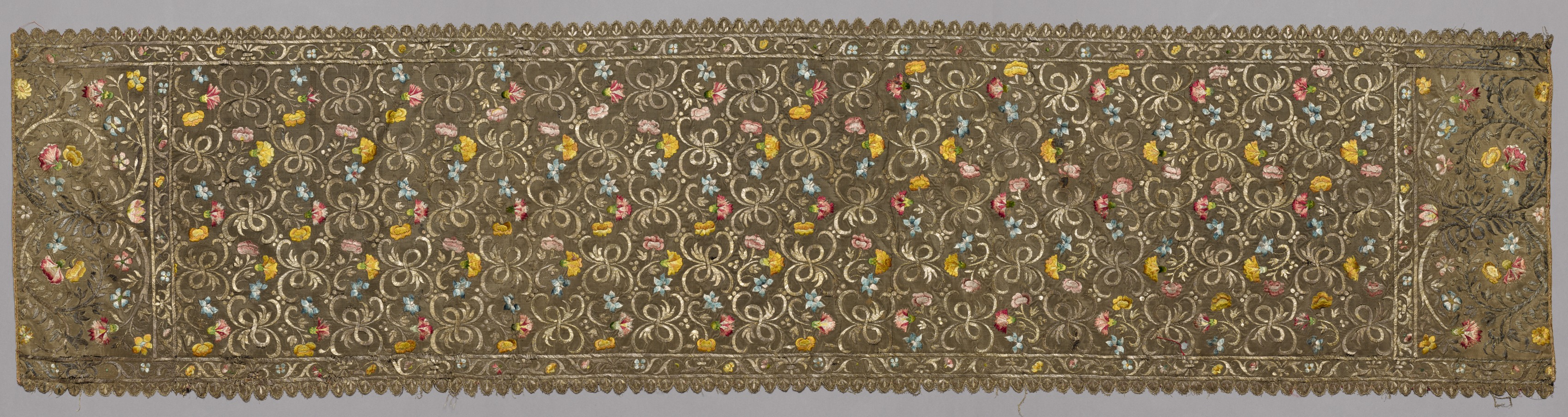 Rectangular panel made of brown fabric with intricate gold embroidery; a repeating pattern of curvy vines and floral motifs in pink, blue, and yellow; a broader decorative border along top and bottom edges, with a thinner line dividing the panel into two equal sections; scalloped edges along the top and bottom. Panel, Probably from a Christening Mantle by Unknown.