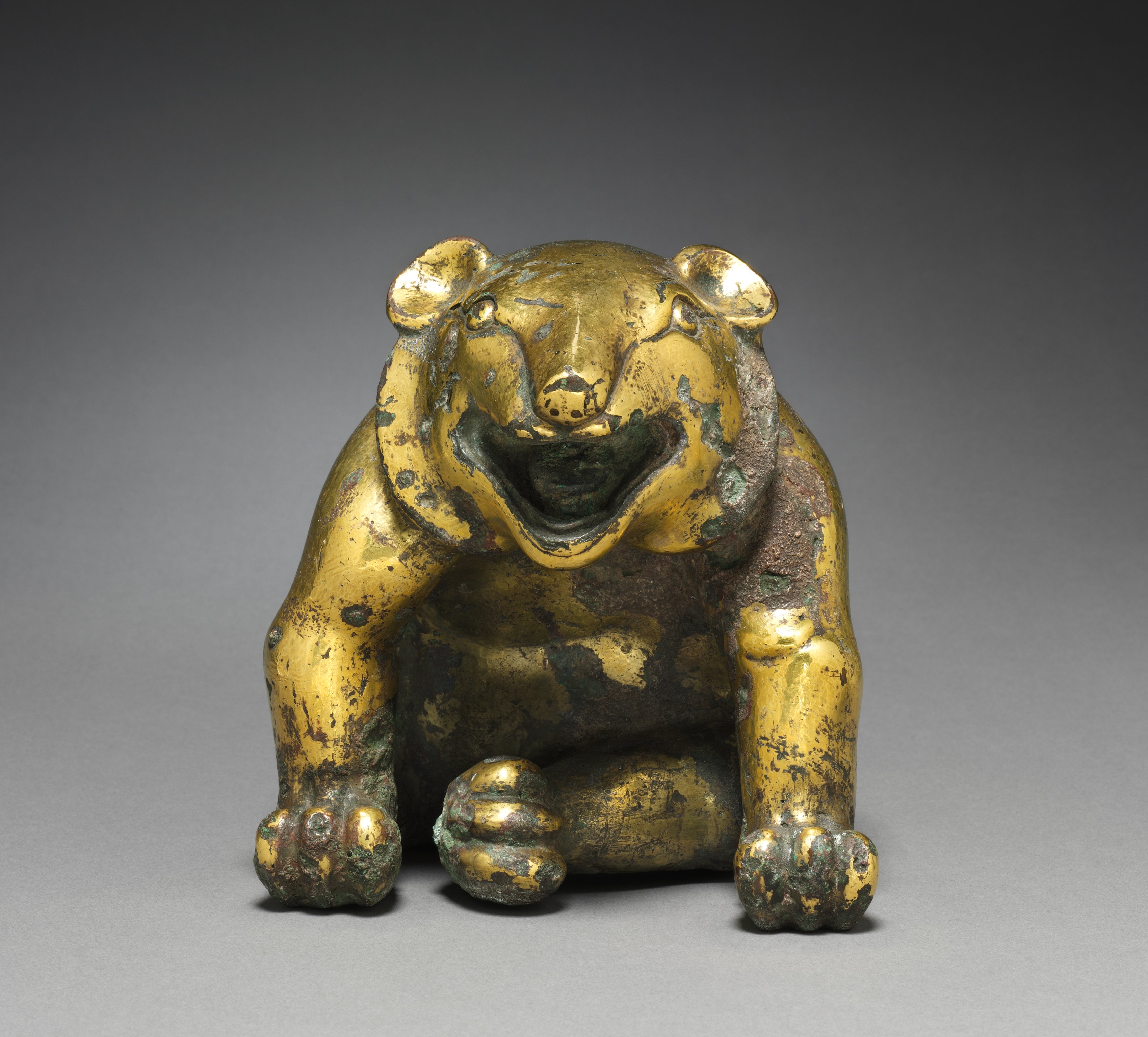 The sculpture titled "Mat Weight in the Form of a Bear" by an unknown artist depicts a bear in a crouched position. The bear appears to be made of bronze or brass and has a predominantly gold color with areas of green and black patina visible. The bear's mouth is open, showing its teeth, and its ears are perked up. The sculpture shows signs of wear and tear, with scratches and patches of discoloration on its surface. The bear's front paws are positioned in front of its chest, with the paws facing forward. The background of the image is a gradient of gray, transitioning from dark at the top to light at the bottom. The sculpture appears to be sitting on a flat surface.