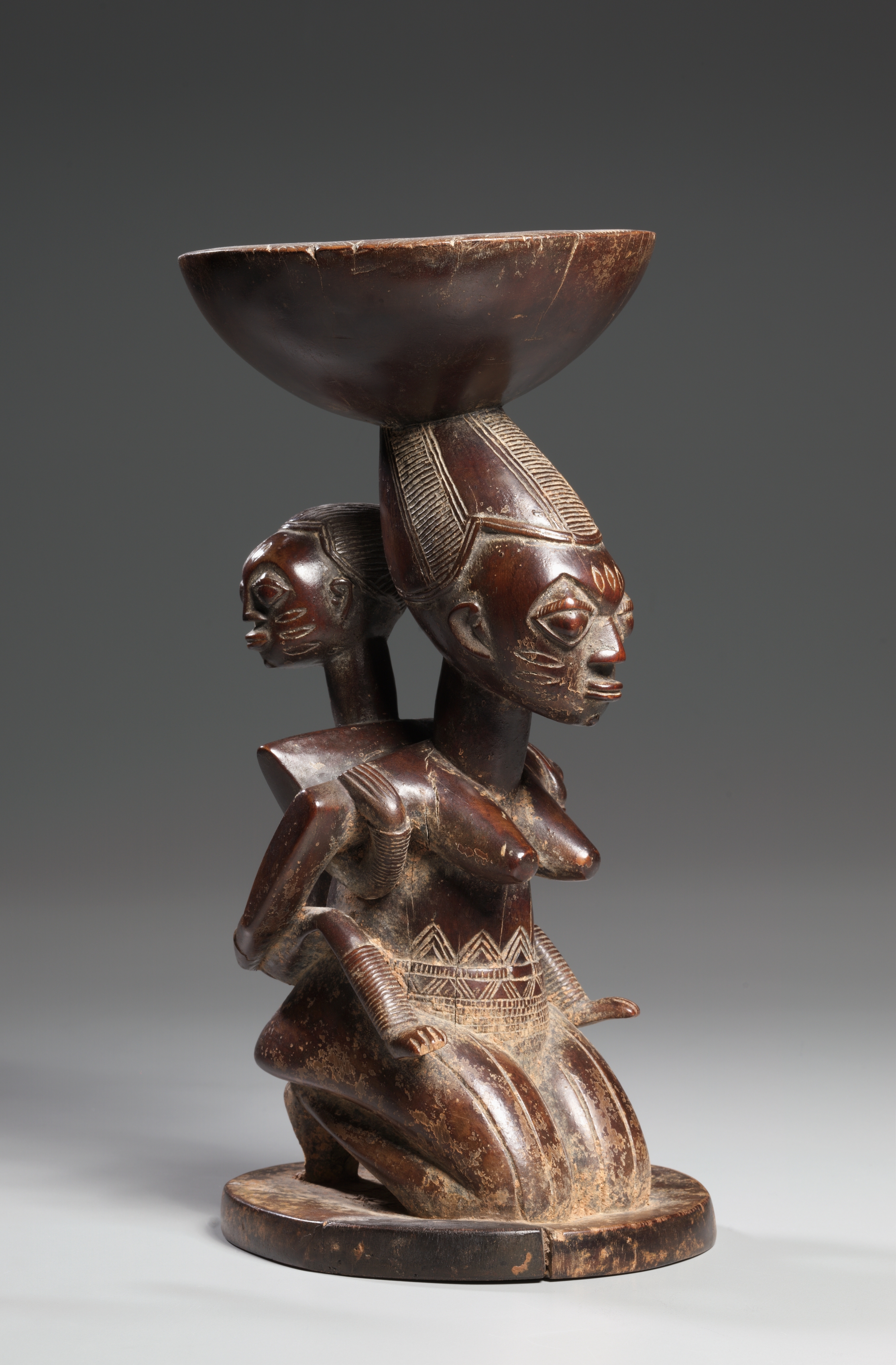 Dark brown wooden sculpture of two figures. The figure in front is kneeling on one knee, with the other leg bent in front. The figure has both arms bent. One arm is resting on the bent leg, while the other arm is resting on their knee. The figure has a large bowl on their head. The figure has geometric patterns etched into the hair and the clothing. A smaller figure is behind the main figure, on their left. The smaller figure has their head resting on the main figure's shoulder. The smaller figure's face is turned to the left. The background is gray.