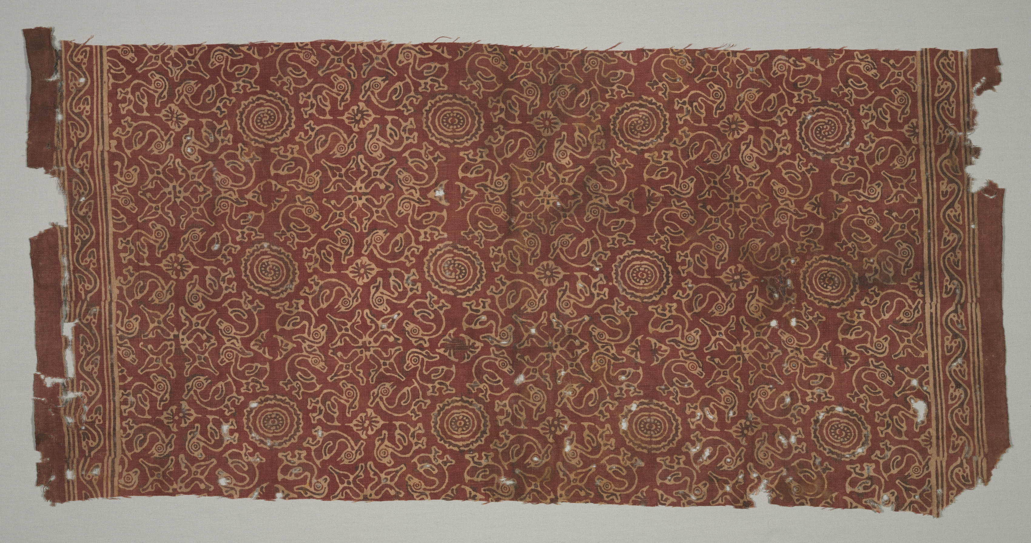 Reddish-brown rectangular textile fragment with frayed edges. The textile features a repeating pattern of golden designs on a reddish-brown background. The designs include: - Circles with curved lines - Small flowers - Goose-like birds circling the circular motifs The edges have a border with golden stripes and patterns. The textile has some white spots scattered across it, possibly holes or patches. The background behind the textile is light gray.