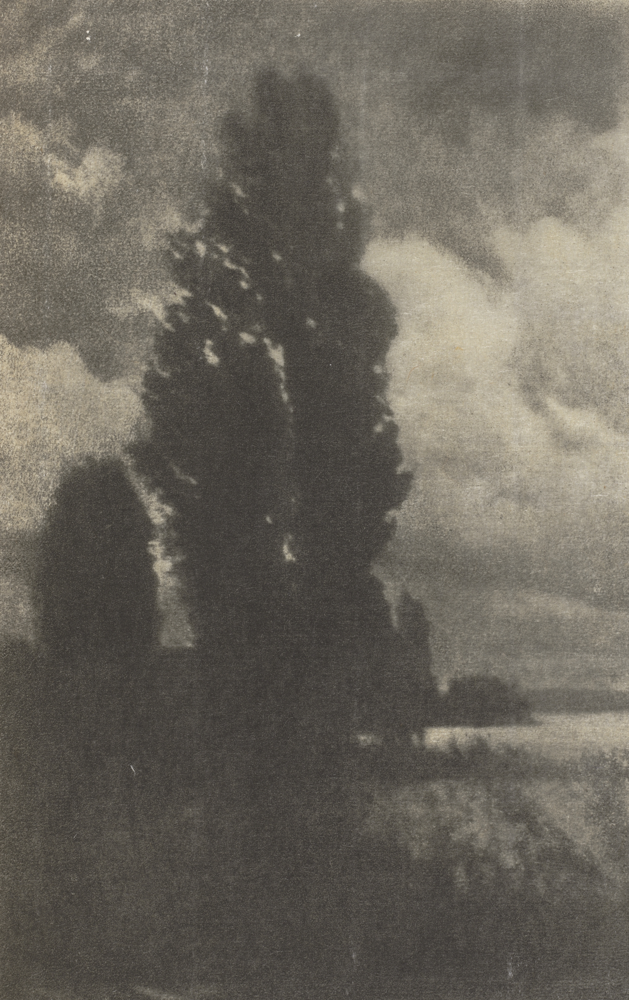 Black and white photograph of a landscape with trees and clouds. A group of dark trees stands on the left side, with one tall tree in the center. The sky above has large, fluffy white and gray clouds. A body of water is visible on the right side. The image is blurry and grainy. The title is "Poplars and Clouds". The artist is Hans Watzek.