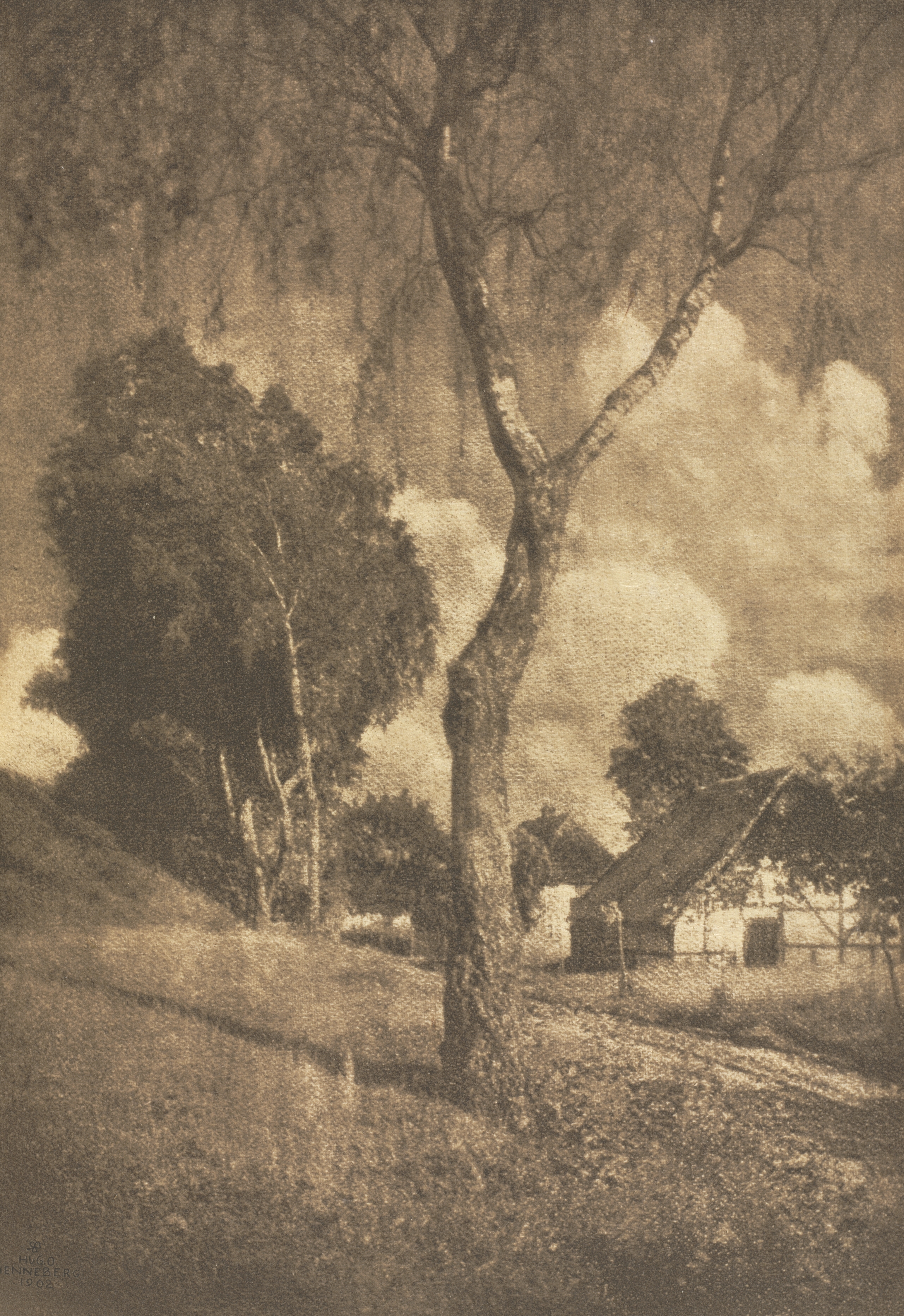 Sepia-toned photograph of a landscape. A tree with a thick trunk and bare branches stands in the foreground on the right side of the image. The tree's trunk is thick and gnarled. A dirt road or path leads to a small white house with a dark roof and a fence in front of it. There are several trees on the left side of the image, some with leaves and some without. The sky is cloudy. The overall atmosphere suggests a rural or countryside setting. The image is titled "Camera Work: Pomeranian Motif" by Hugo Henneberg.
