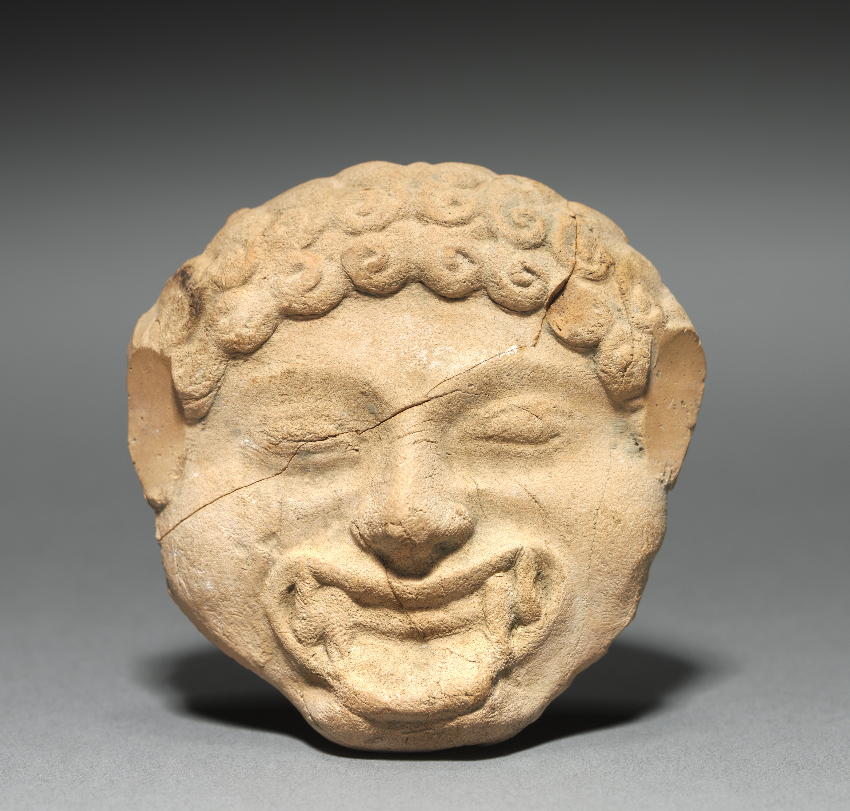 Beige-colored stone plaque with a face carved into it. The face has curly short hair on top and sides, with large ears. It appears to have a large nose and a wide open-mouthed smile showing teeth. The face looks grotesque or comical. A figure of a man with an upturned face, dancing, is etched into the bottom right section. The man appears to have his arms raised. The background is gray.