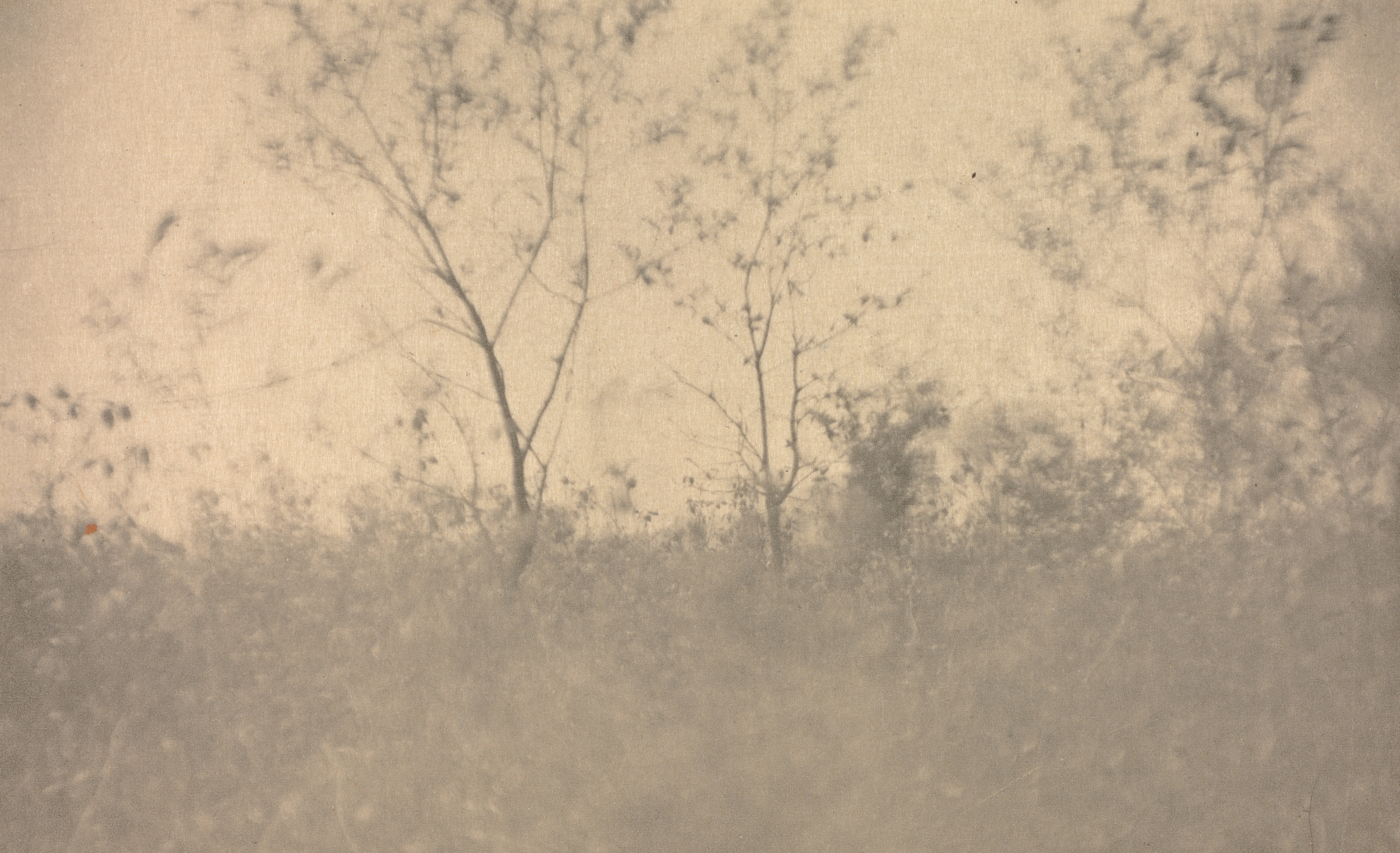 Sepia-toned photograph of a landscape. Bare trees with thin trunks and branches are centered in the image. Trees and tall grasses fill the foreground and background. Image is soft and slightly blurry. Small dark spots and lines are scattered throughout. A lighter area is at the top, and a darker area is at the bottom.