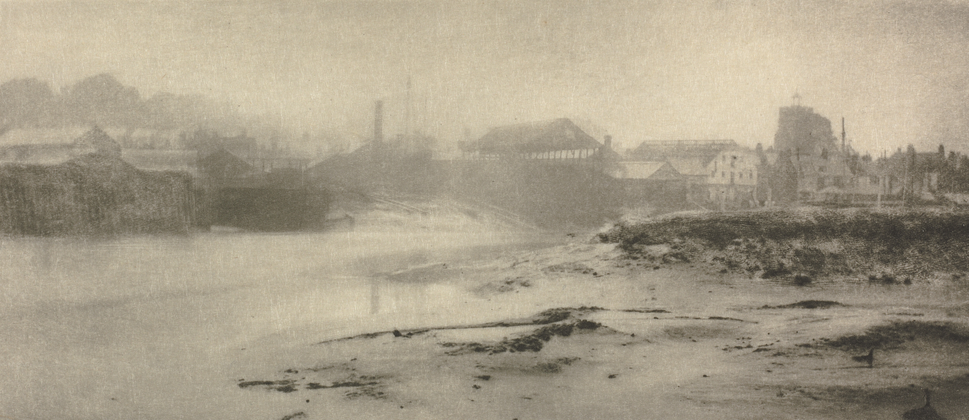 Sepia-toned landscape photograph. Body of water fills the lower-left corner. A long wall stretches across, lined with buildings on either side. Darker structures line the left edge. A stony shore juts into the water on the right. A large church or similar building appears on the right edge. Sky is light, even throughout.