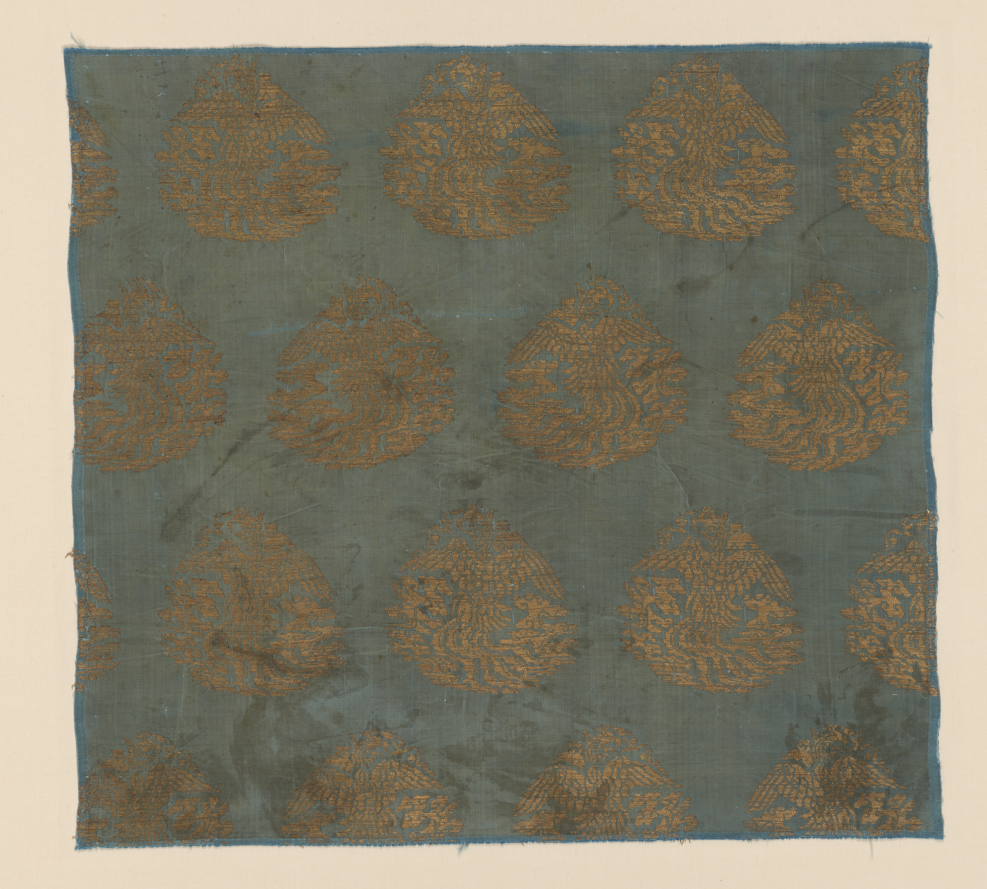 Brocade with Soaring Phoenixes among Clouds by Unknown. The image shows a square piece of fabric with a blue-grey background. The fabric features 12 identical teardrop-shaped motifs arranged in four rows of three. Each motif depicts a phoenix with intricately detailed feathers, standing on a branch or mound. The phoenixes appear to be surrounded by clouds. The motifs are gold-colored and have a shiny appearance. The fabric has a rough, uneven edge and some dark spots or stains. It is set against a beige background.