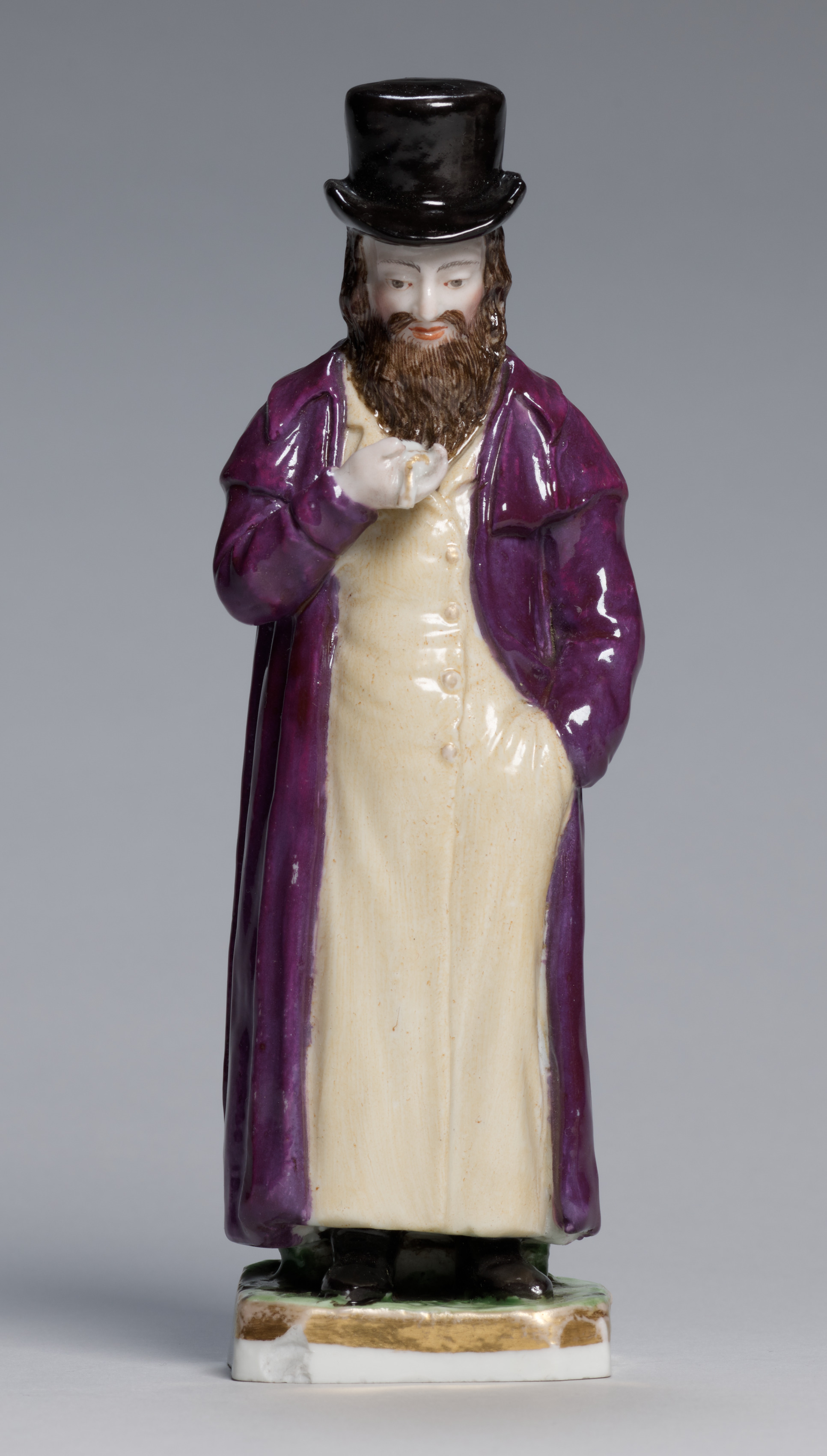 Ceramic figure of a man wearing a purple coat, cream-colored dress, and black top hat. The figure has a brown beard and mustache. He is holding a pocket watch in his right hand. His left hand is in his coat pocket. The figure stands on a small square base with a green and brown design. The background is gray.