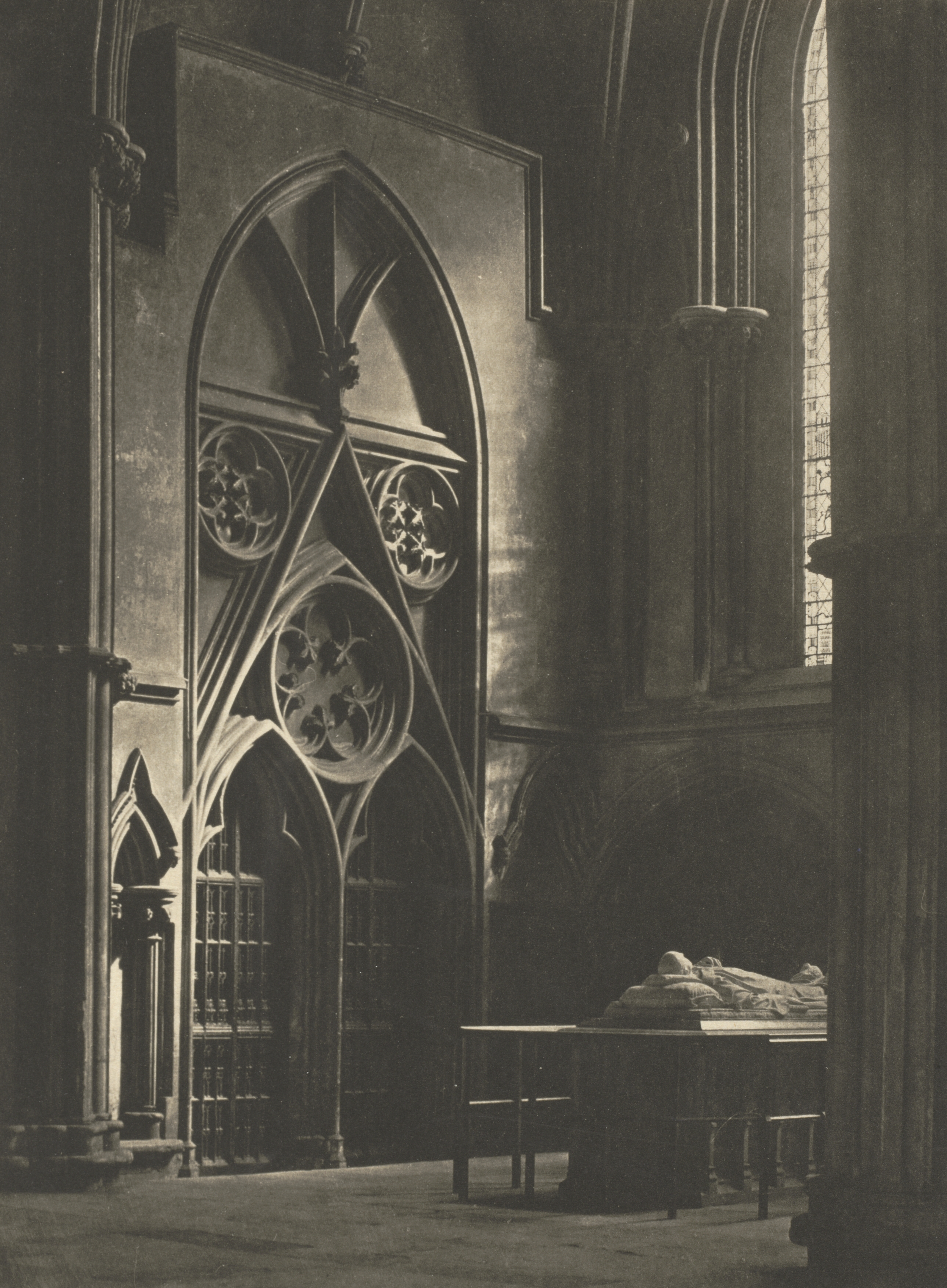 A black-and-white photograph of an interior view of a church. A long table with benches on either side is on the right. A stone sarcophagus is on top of the table covered in a cloth. On the left is a large pointed archway with ornate circular designs within it. To the right of the archway is another pointed archway with stained glass. The walls are made of stone. The photograph is titled "In Sure and Certain Hope" by Frederick H. Evans.
