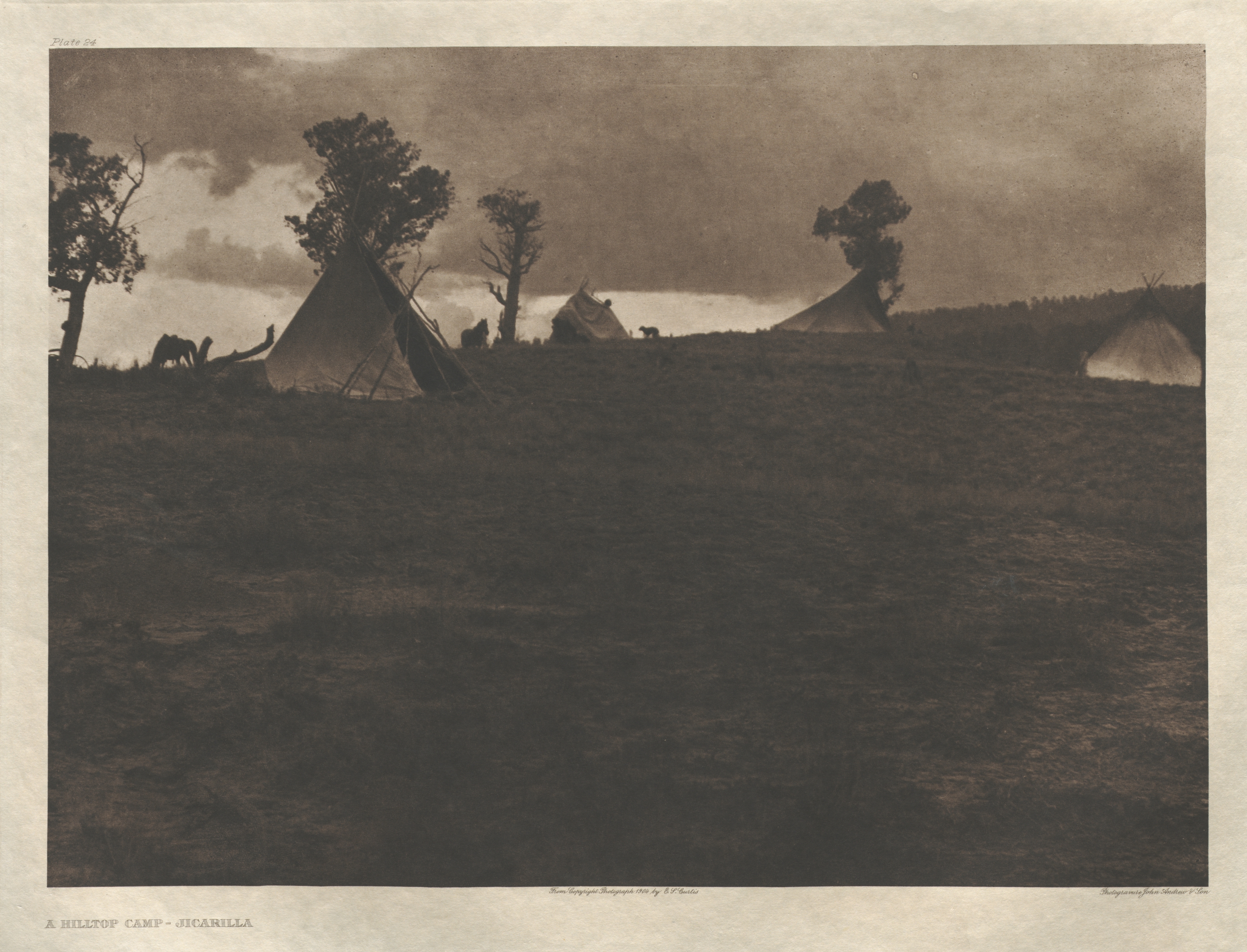 Black and white photograph of a landscape. A grassy hill slopes down from the center to the bottom. A line of four teepees standing in a line on the hilltop in the background. The teepees to the left and right are closer to the viewer than the two in the center. A person wearing a hat visible between the two center teepees. Trees line the top of the hill, the one to the left with a rounded top, the one to the right with a skinny trunk and a bushy top. The sky is cloudy. The image is slightly sepia-toned. The photograph sits on a thicker piece of paper with slightly rounded edges and a thin border around it. Text centered on bottom border in capital letters: A HILLTOP CAMP - JICARILLA.