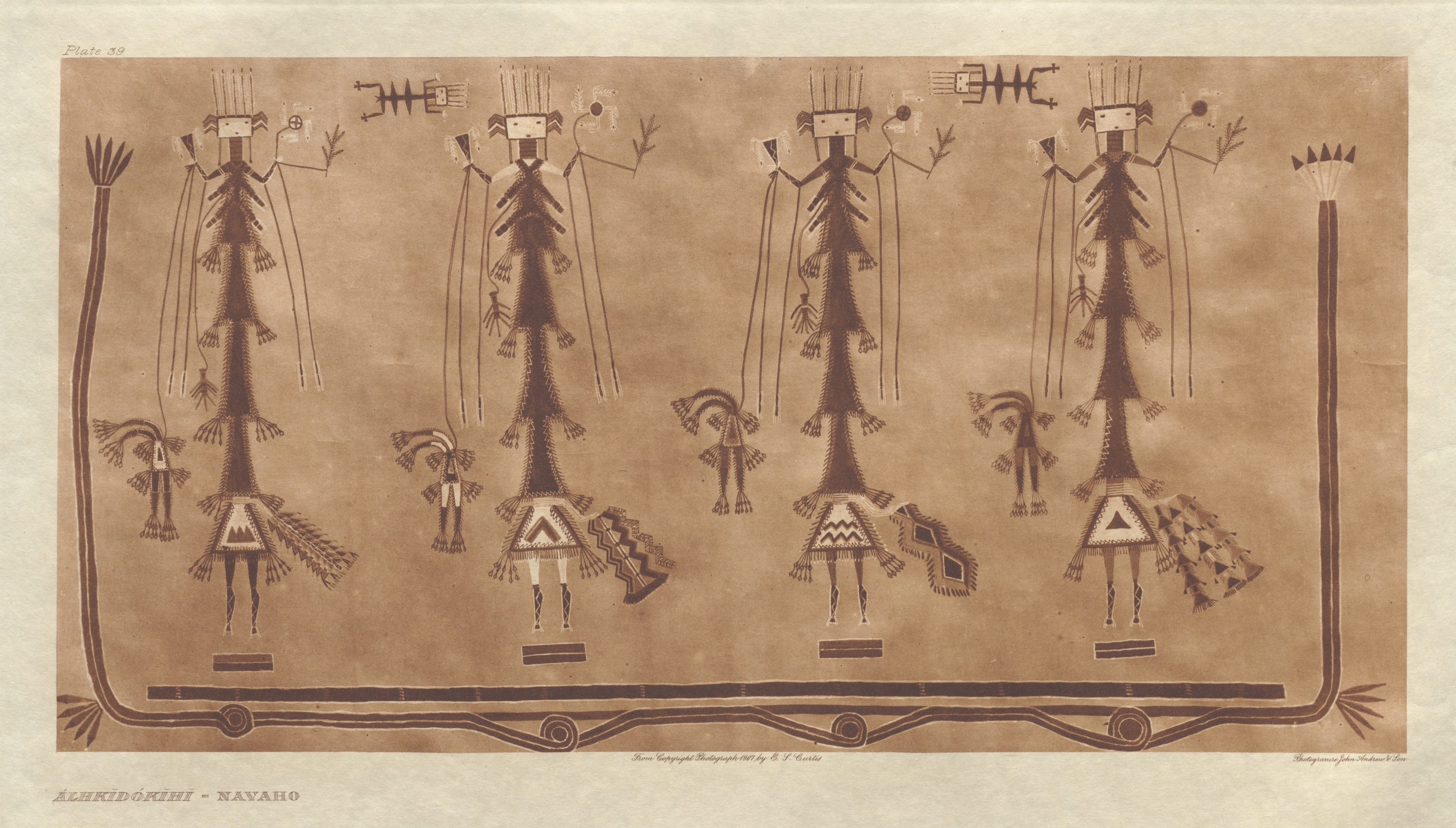 Brown and white drawing on brown background. Five figures with rectangular heads and long bodies standing. Each figure has lines on head, arms and legs. Two lines on bottom of feet. Figures have triangular shapes on lower bodies. Long lines extend from hands. Four figures have objects in left hands. Five figures have fringe on bodies. Two lines with circular designs under figures. Short lines on bottom. Two lines with circular designs on bottom. Text in bottom left corner reads "Alhkidókihi - Navaho".