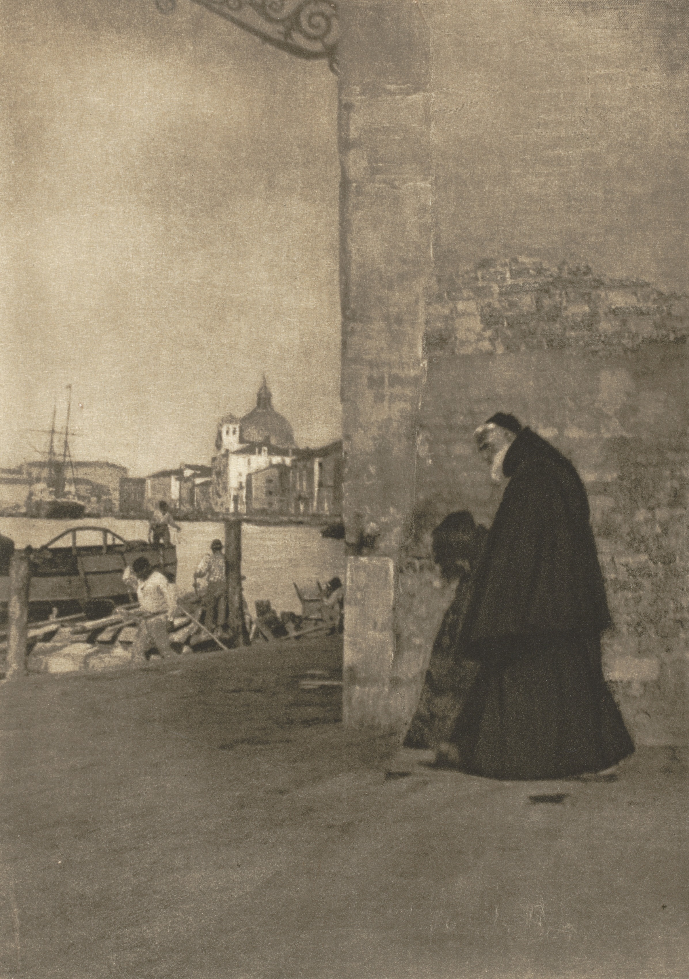A sepia-toned photograph of a man in a long, dark robe with a white beard walking next to a large stone wall; he appears to be a Franciscan. The man is walking on a paved area. A body of water with a boat and a distant cityscape are on the left. Other people are on the left near the water. The cityscape includes a domed building. The photograph is titled "Camera Work: A Franciscan, Venice" and was taken by J. Craig Annan.