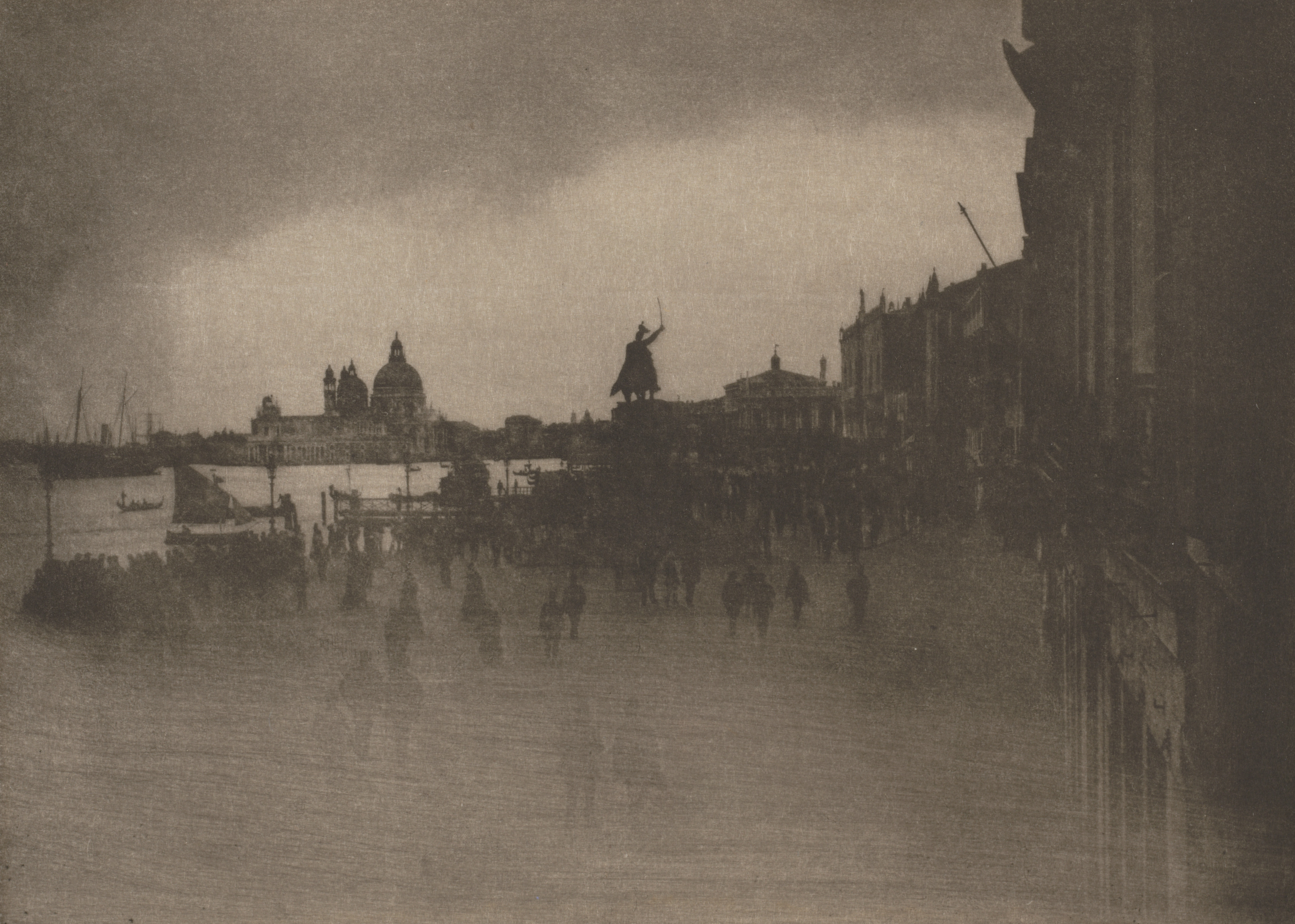 The image depicts a flooded city street with people walking through the water. A large body of water fills the street, with people wading through it. On the right side of the image, there are buildings partially submerged in the water. A statue of a man holding a sword stands on a pedestal in the center of the image. In the background, there are several buildings, including a large church or cathedral with two domes. The sky is overcast and dark. The image is in black and white, with a sepia tone. The overall atmosphere suggests a scene of flooding in a city, possibly Venice, given the architecture and the presence of a canal or river.
