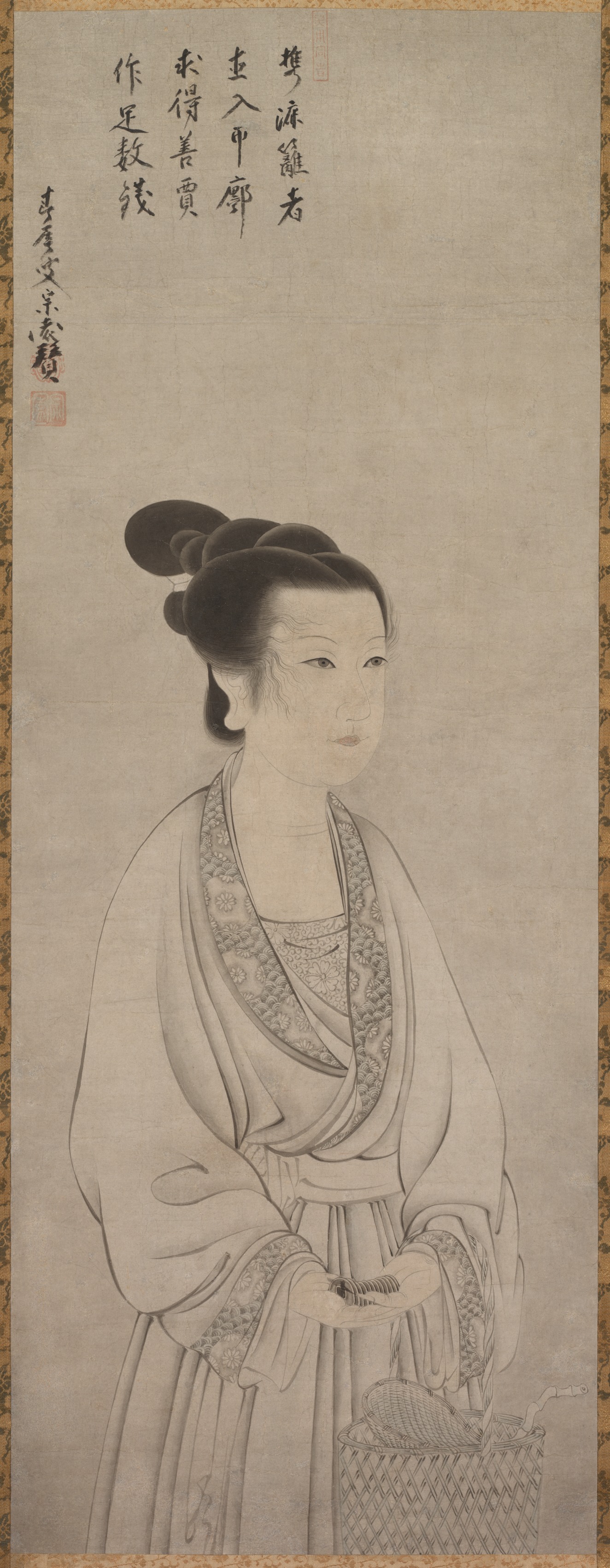A woman with dark hair styled up and a white robe facing right with a wicker basket at her side. The robe has intricate detail and she is holding an object in her hands. There is writing in a foreign script in the top left corner.