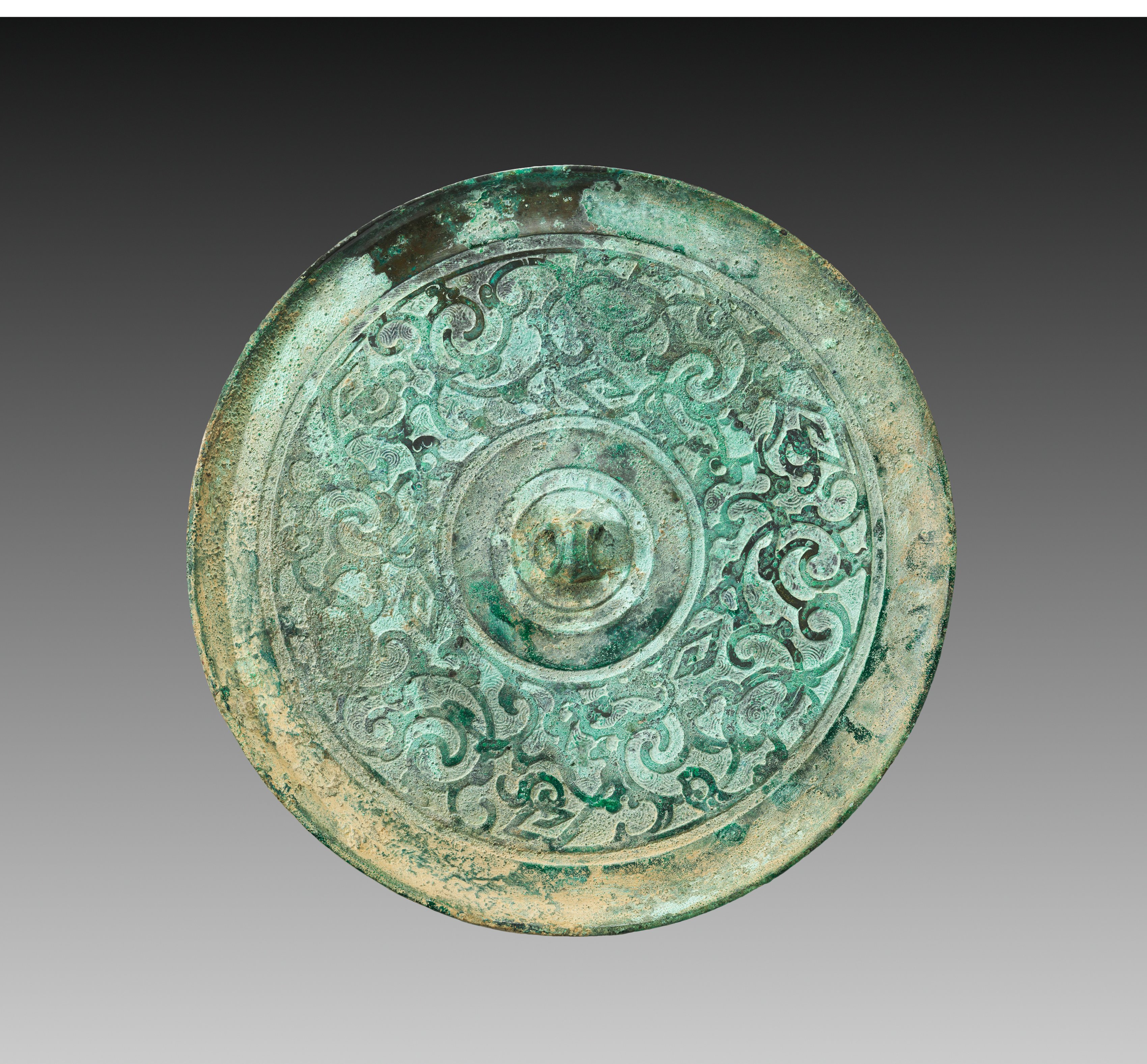 The image depicts a circular, flat object with a raised circular pattern in the center. The object has a green patina and exhibits a weathered appearance. The object is round and flat. The center features a raised circular pattern. The surface has a green patina with visible signs of wear and aging. A raised border encircles the central design. The central design features raised lines radiating outward. The background transitions from dark gray at the top to light gray at the bottom. The object titled "Mirror with Serpentine Interlaces and Angular Meanders" is by an artist unknown.