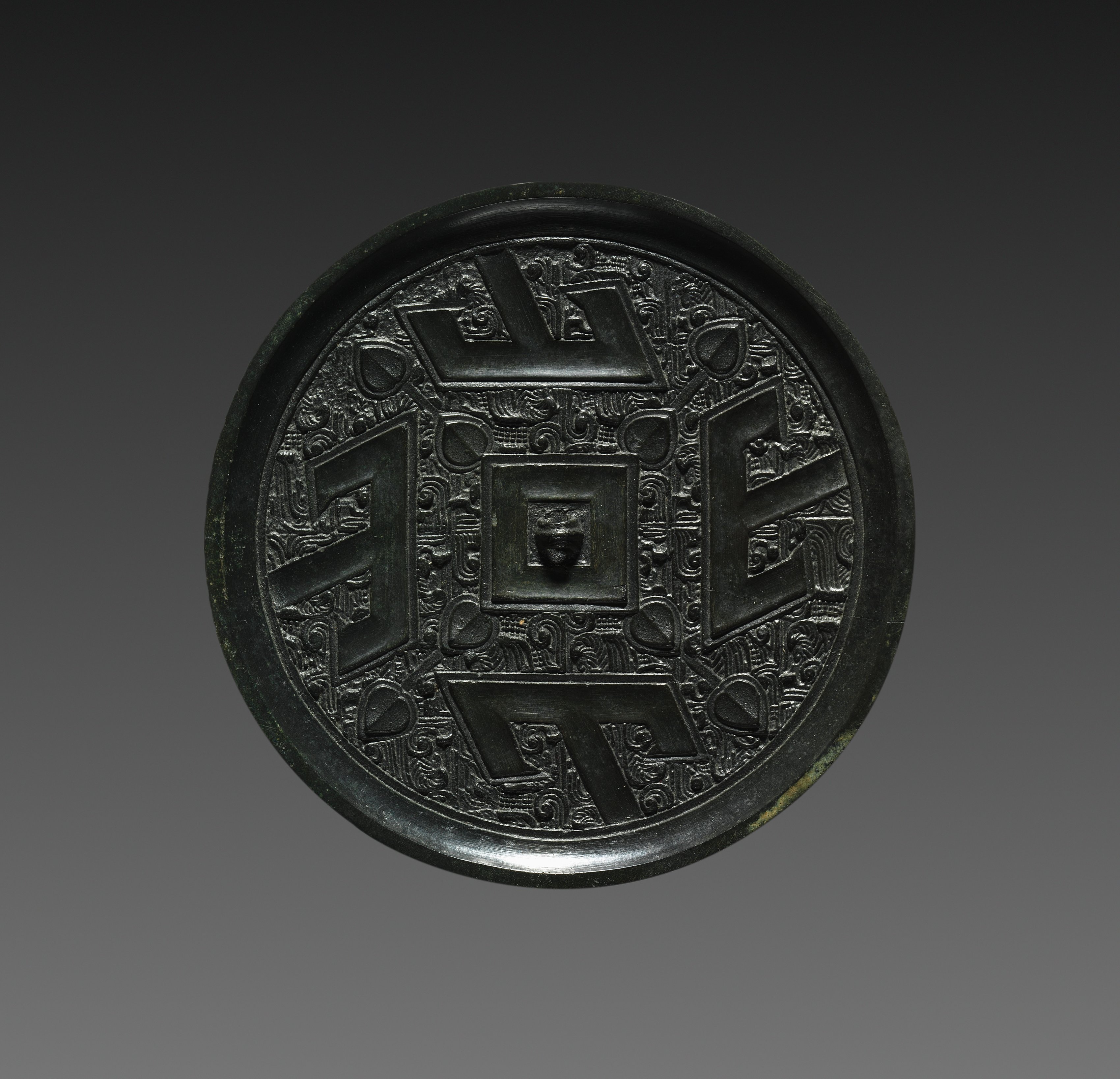 The Mirror with Four T's by an unknown artist is a round, black, ornate object. The object has a raised edge and a flat, circular surface with a design. The design consists of a central square with a small, square indentation in the middle. Four T-shaped protrusions extend from the center, one in each cardinal direction. The T-shaped protrusions are symmetrical and have a similar design. The background of the object features an intricate pattern of lines, swirls, and shapes. The object appears to be made of a dark, possibly metallic material, and has a weathered appearance. The background of the image is a gradient of dark gray to light gray.