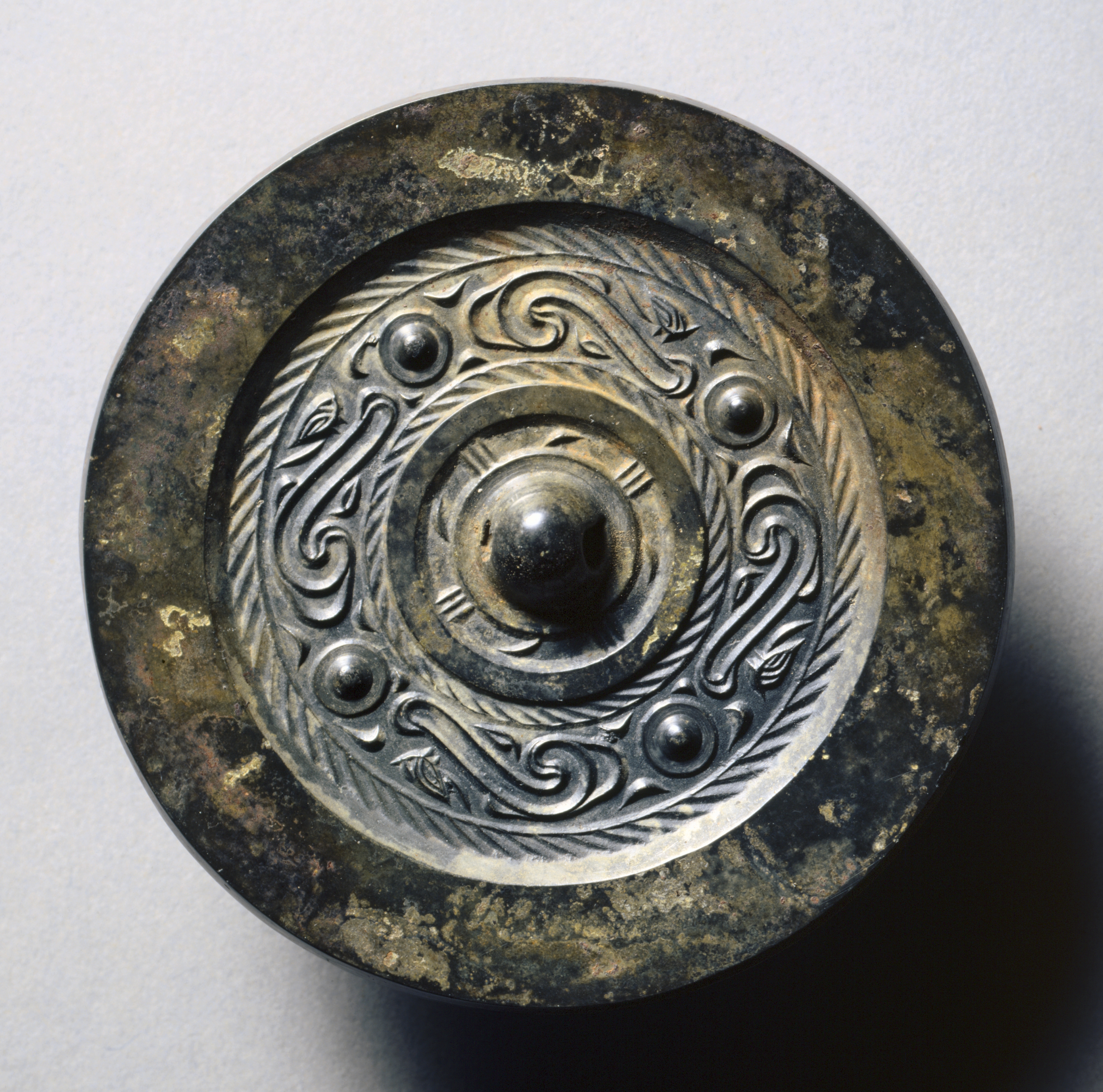 The object appears to be a circular bronze mirror. The mirror has a bronze-colored metal body with a darker patina on the outer edge. The center is decorated with a spiral design consisting of raised lines and four nipple-like protrusions. A raised circle with another nipple protrusion sits in the center. The mirror appears to be quite old. A thick line wraps around in a spiral. Alongside the spiral are some small balls and what appears to be a bird-like figure, along with quasi-dragon-like figures on the mirror.