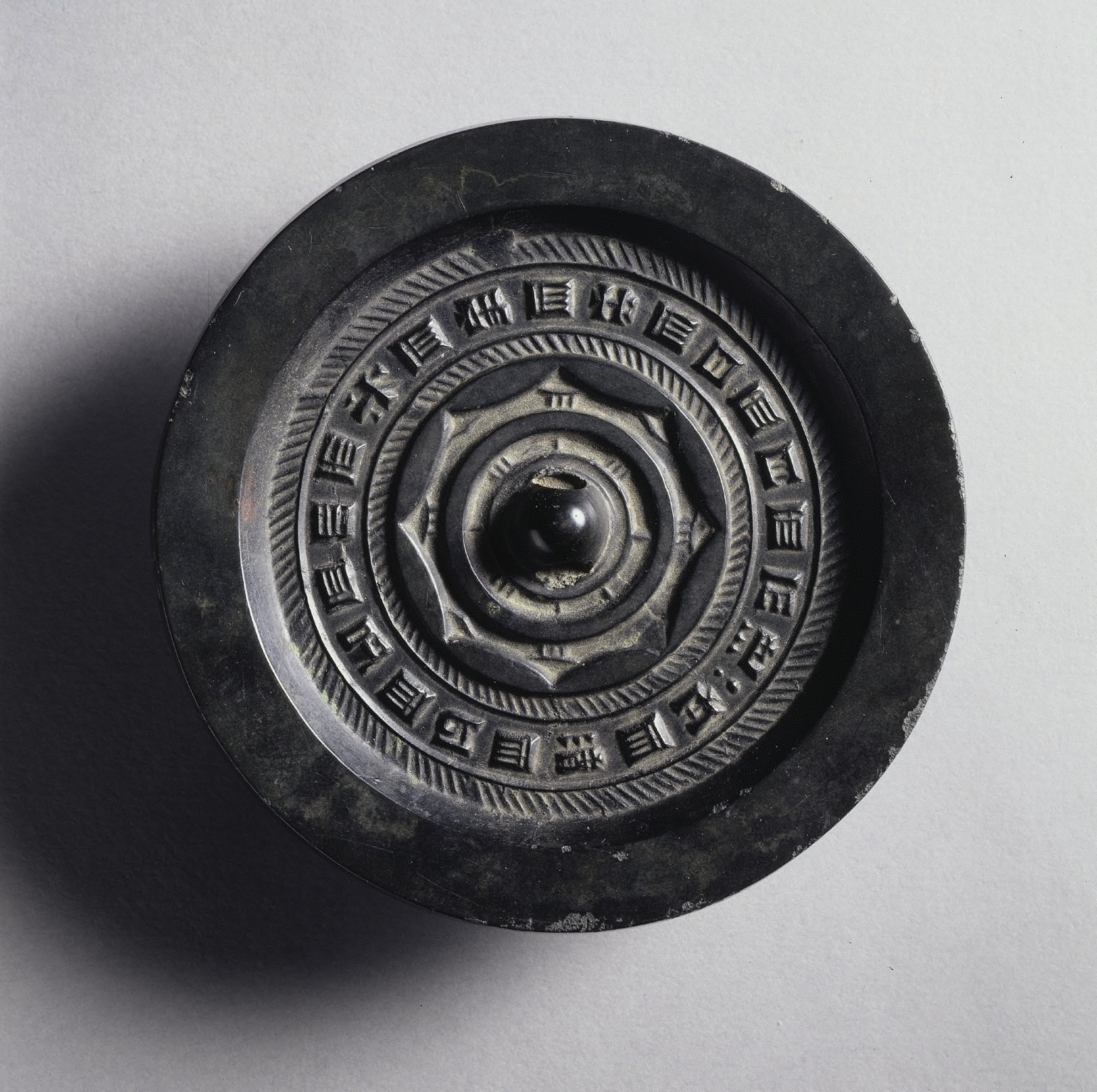The Mirror with Concentric Circles and Linked Arcs by Unknown Artist shows a circular, dark gray or black object with a raised design. The object has a thick, rounded edge and a recessed center. The center features a small, raised circle surrounded by concentric circles. The innermost circle has a series of curved, pointed shapes. The next circle has a rope-like pattern. The next circle features symbols etched into it, possibly Chinese characters. The outermost circle has a rope-like pattern. The background is light grey with a shadow cast by the object.