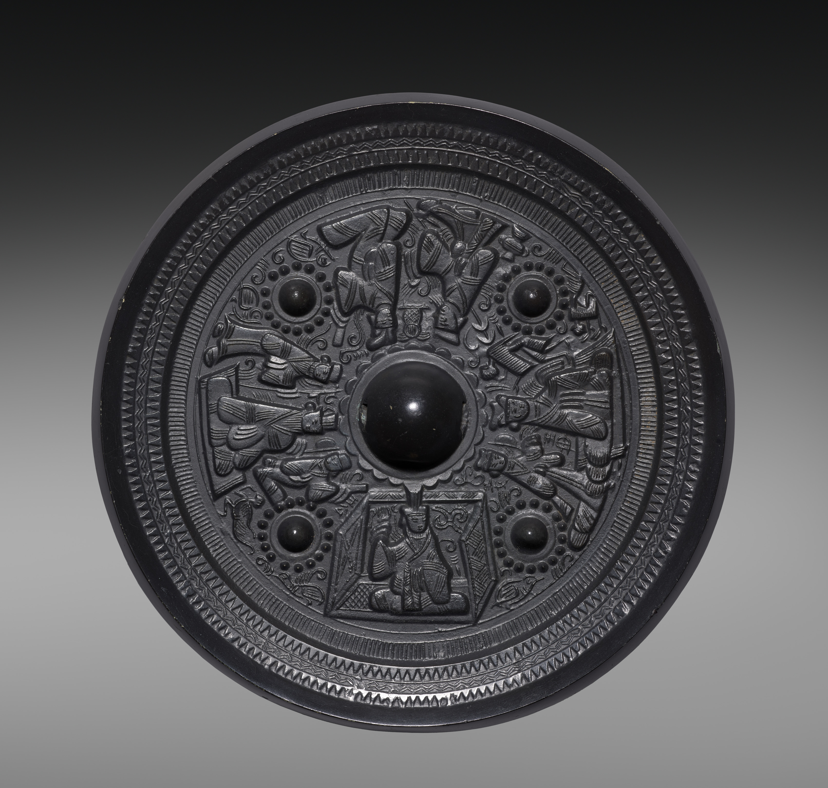 The Mirror with Deities and Kings is a round, black, ornate object. The object has a raised outer rim and a large circular indentation in the center, with a smaller circular raised area around it. The center indentation is black and shiny. The surface features intricate carvings of various figures, including deities and kings, arranged in a symmetrical pattern around the center. Three smaller circular indentations are positioned around the center indentation. The background of the image is a gradient, transitioning from dark at the top to light gray at the bottom. The object is set against this gradient background. The carvings on the object are detailed and appear to be of historical or cultural significance. The overall appearance suggests an ancient or traditional artifact. The object is likely made of a dark material, possibly stone or metal.