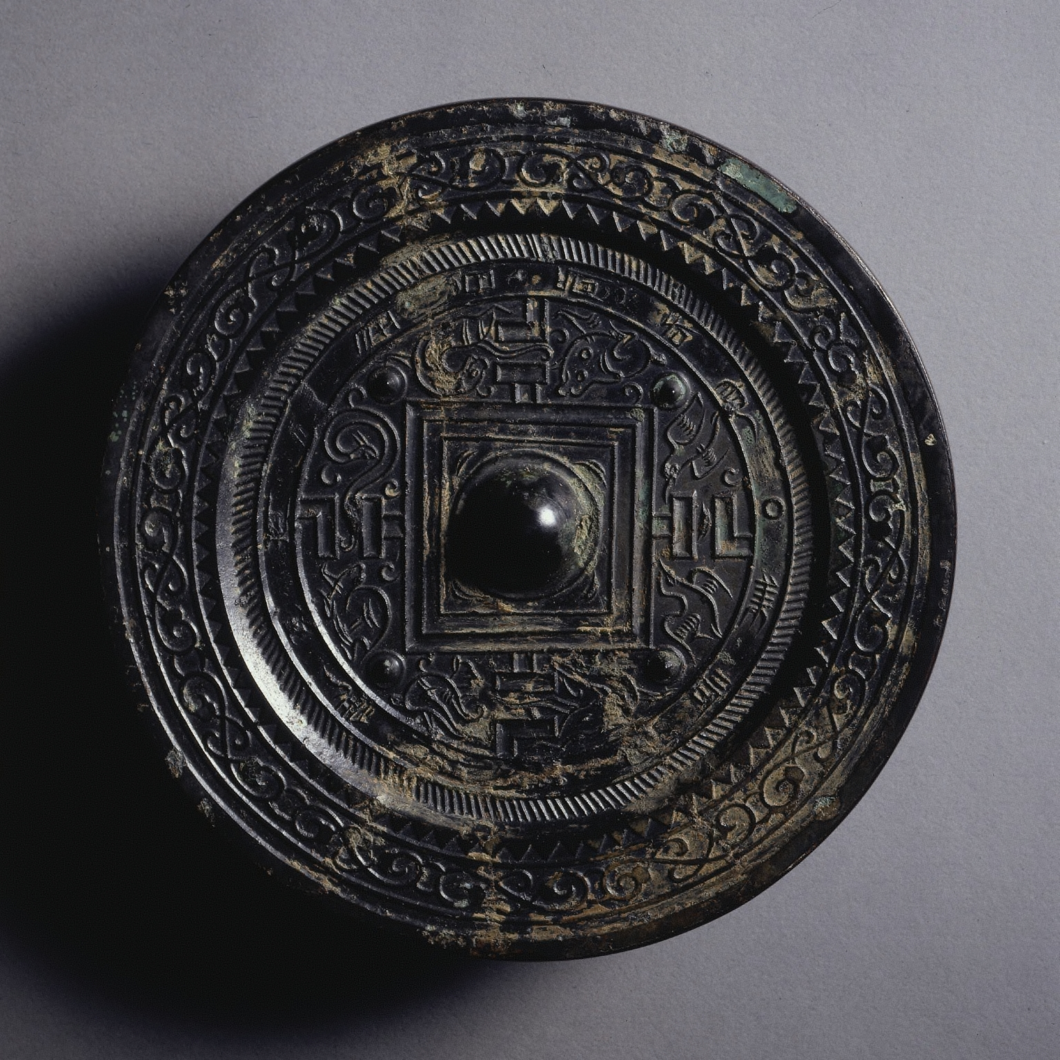 The TLV Mirror by unknown artist; A round bronze mirror with a dark patina; The mirror has a raised square in the center with a circular protrusion; The square is surrounded by a band with four symmetrical designs; There are multiple concentric raised circles around the center; The circles are decorated with various patterns, including geometric shapes and scrollwork; The outermost circle features intricate scrollwork; The mirror has a worn appearance with areas of discoloration.