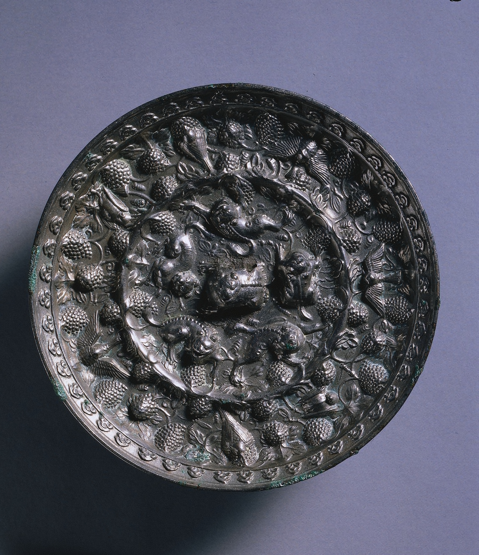 Mirror with Auspicious Animals, Celestial Horses, and Grapevines
