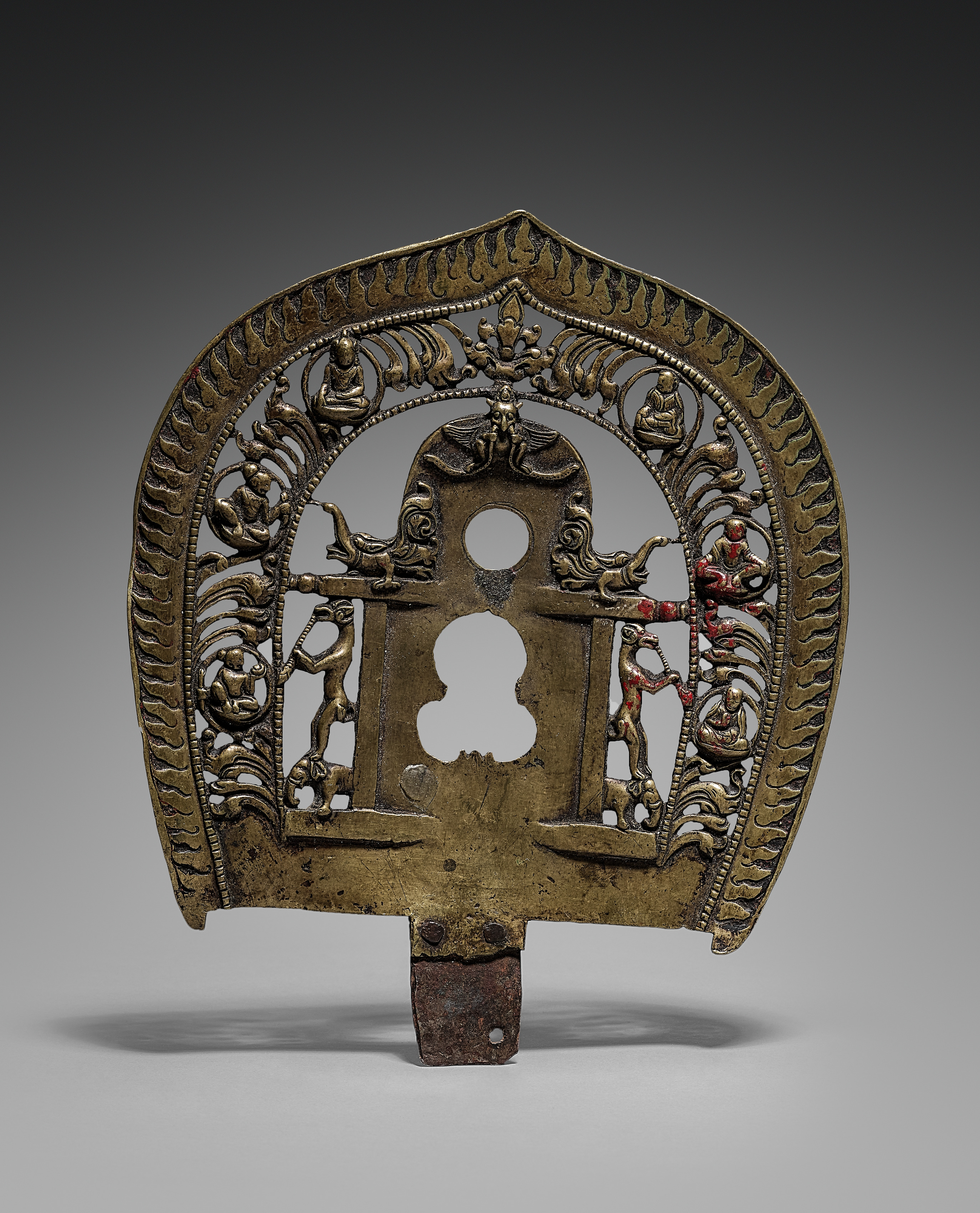 Brass shield-shaped object with a keyhole-shaped cutout in the center. The object is standing upright on a small rectangular base. The top of the object is wider than the bottom and comes to a point. There is a decorative border around the edge featuring flames. Inside the border are various figures and designs, including people sitting in a circle and people standing on either side of the central cutout. The object has a dark patina and appears to be old. The background is a gradient from dark gray at the top to light gray at the bottom. The object titled "Halo" by the artist.