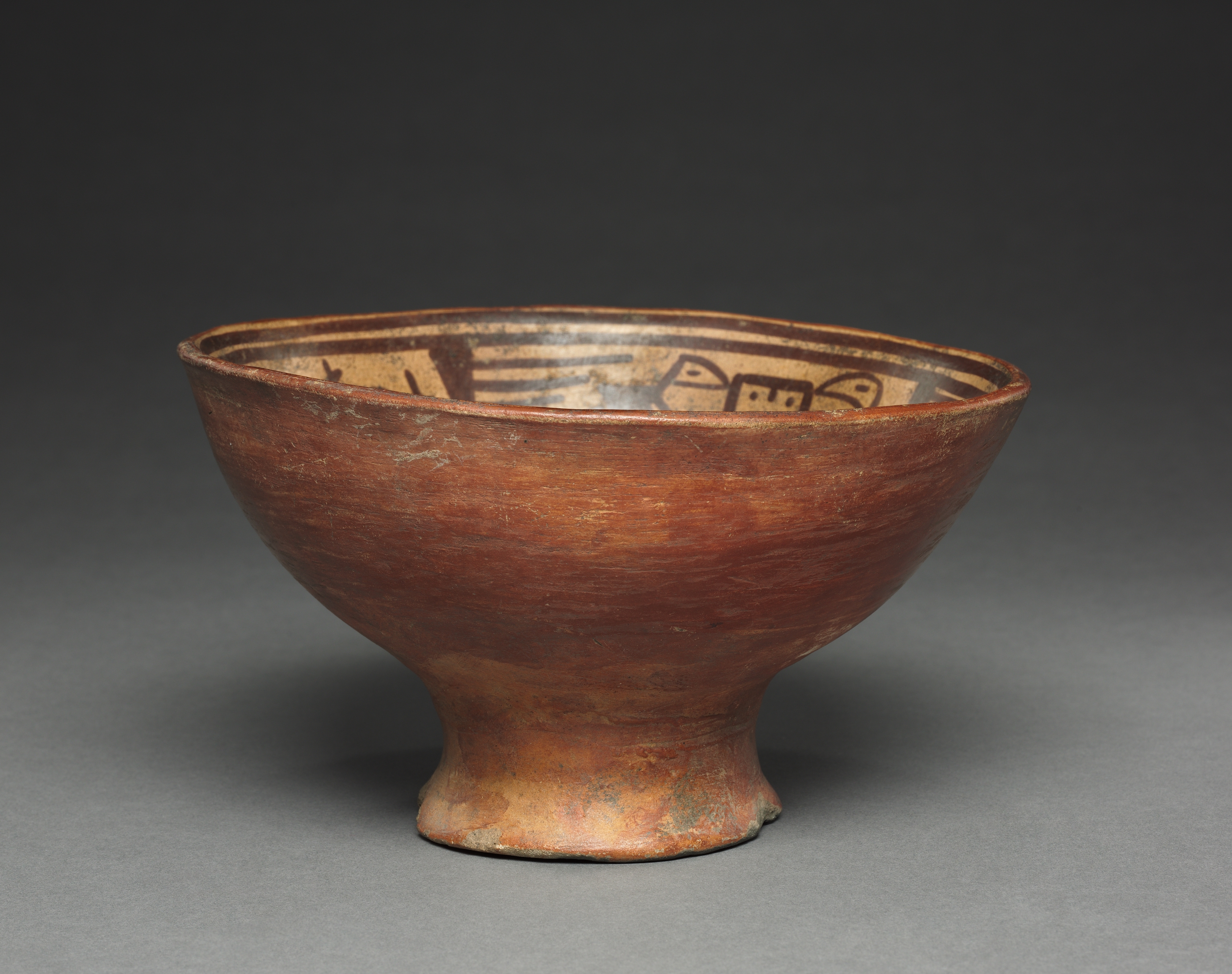 The bowl is a reddish-brown color with a wide mouth and a narrow base. The bowl has a short, thick stem or foot at the bottom. The interior of the bowl features a light-brown background with dark brown designs. The designs include geometric shapes and figures of humans and birds. The bowl appears to be made of clay and has a rough texture. The background of the image is dark gray, with a lighter gray surface that the bowl is sitting on.