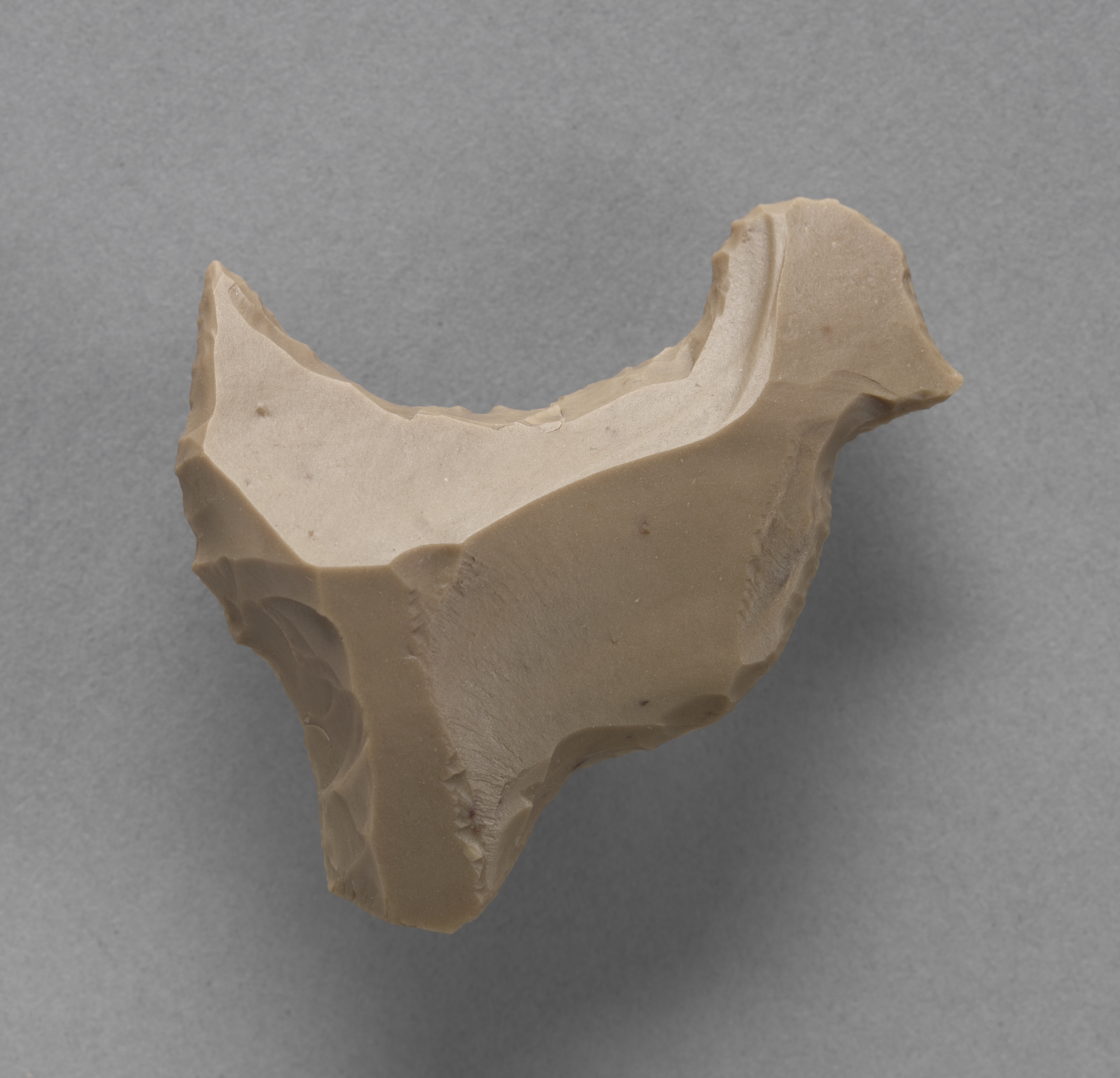 Flint in the Form of a Bird by Unknown. A light brown, irregularly shaped piece of flint carved into a rough bird form. The piece has a curved top and a pointed bottom. The left and right sides extend outwards. The background is gray.