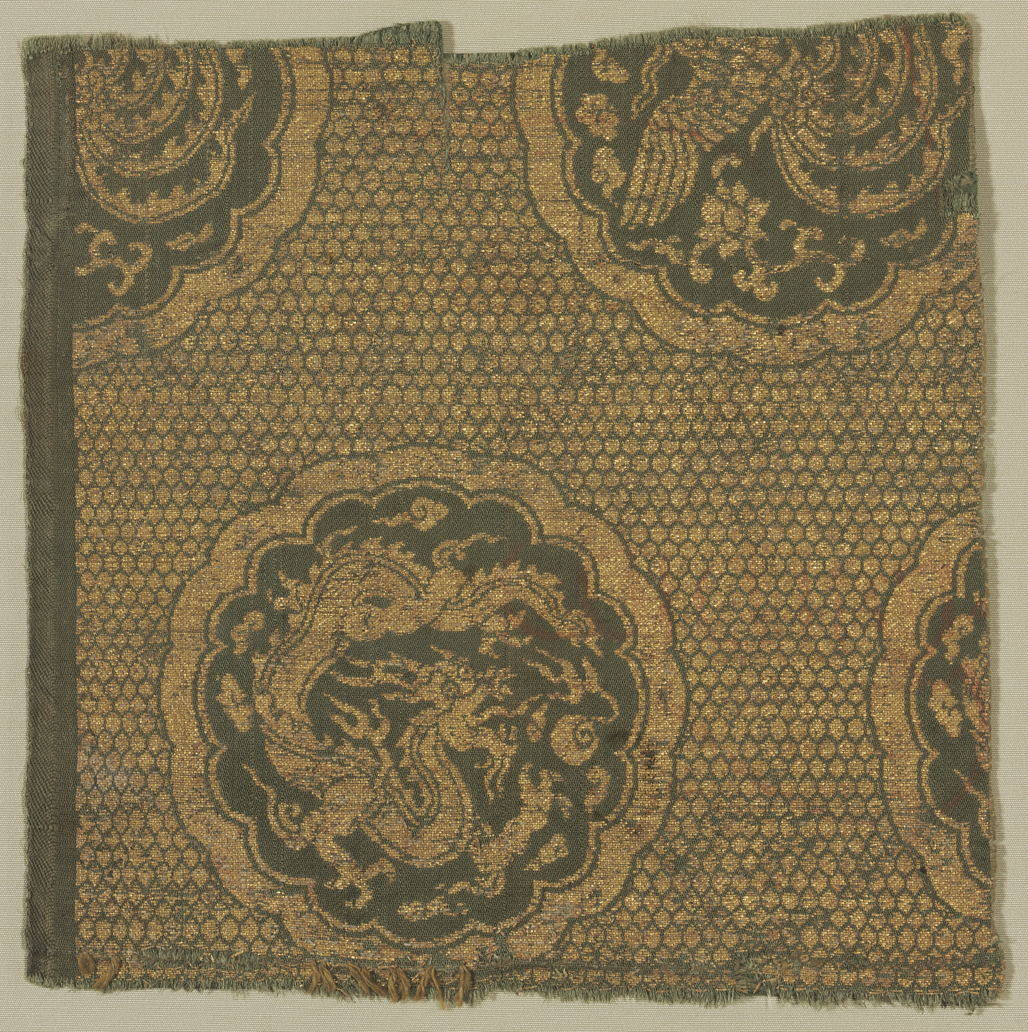 Olive green and gold square textile with frayed edges. The background has a repeating pattern of small gold circles on an olive green base. There are four large circular medallions, one in each corner, featuring designs with dragons and phoenixes in gold and olive green. A dragon design is in the bottom left medallion. The dragon has a long curved body with a scaly texture. Its head faces right and has a long snout. There are flames around the body of the dragon. The top right medallion contains a phoenix design. The phoenix has a large curved beak pointed to the right. A curved body with feathers extends behind the head. The other two medallions are partially visible. A beige background is behind the textile.