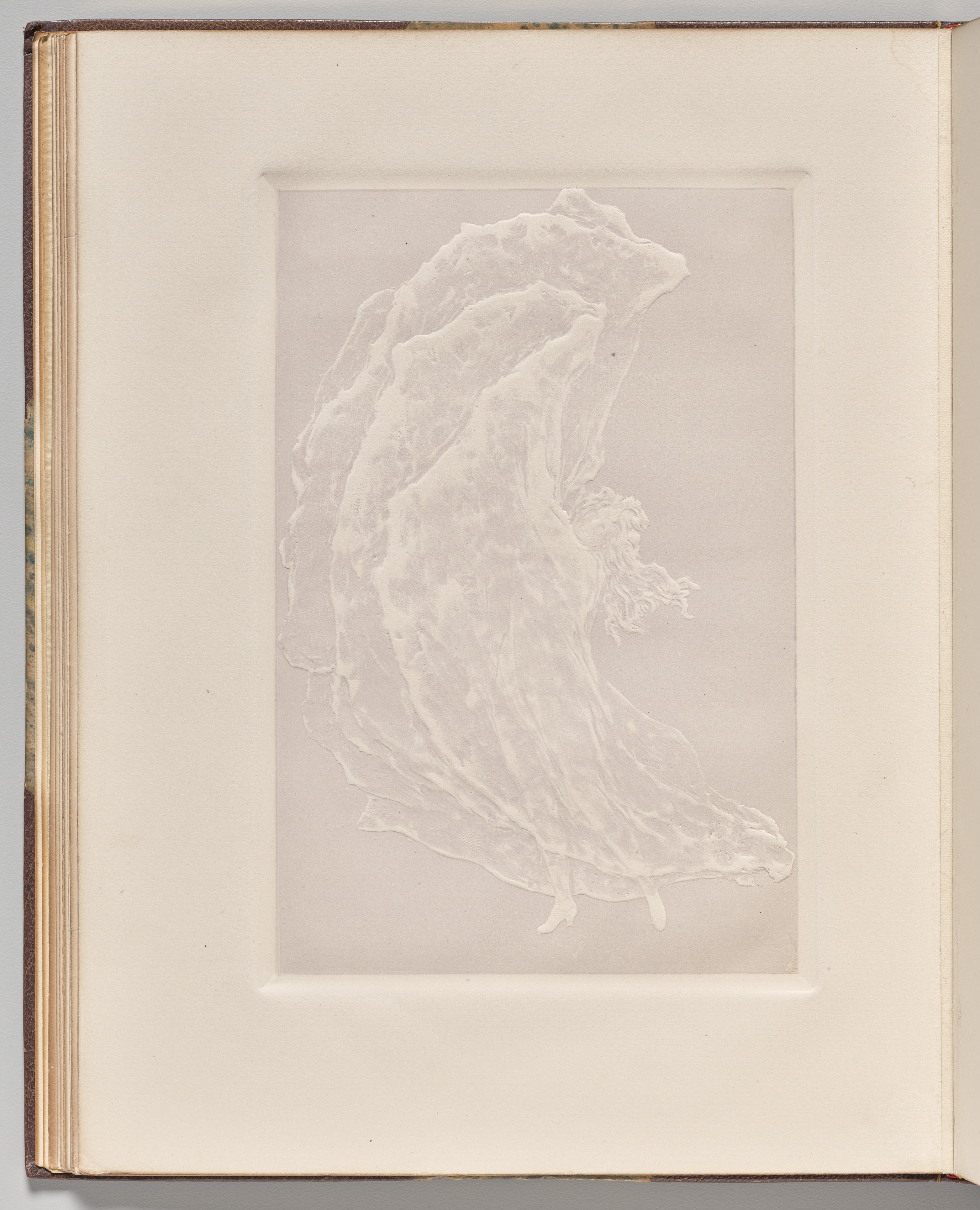 The image depicts "Dancing Woman with Arms Raised up in a Sweep of Drapery" by Pierre Roche. The image shows a white, matte-framed drawing of a dancing woman on a gray background. The woman is drawn in a light color, possibly white or light gray. The woman's arms are raised above her head. She wears a long, flowing garment that appears to be draped around her body and is billowing out behind her. The drawing is placed on a thick, white mat within a book or frame with a brown cover; the pages of the book are visible on the left side. The image is in shades of white, gray, and brown. The drawing appears to be an illustration or a sketch.