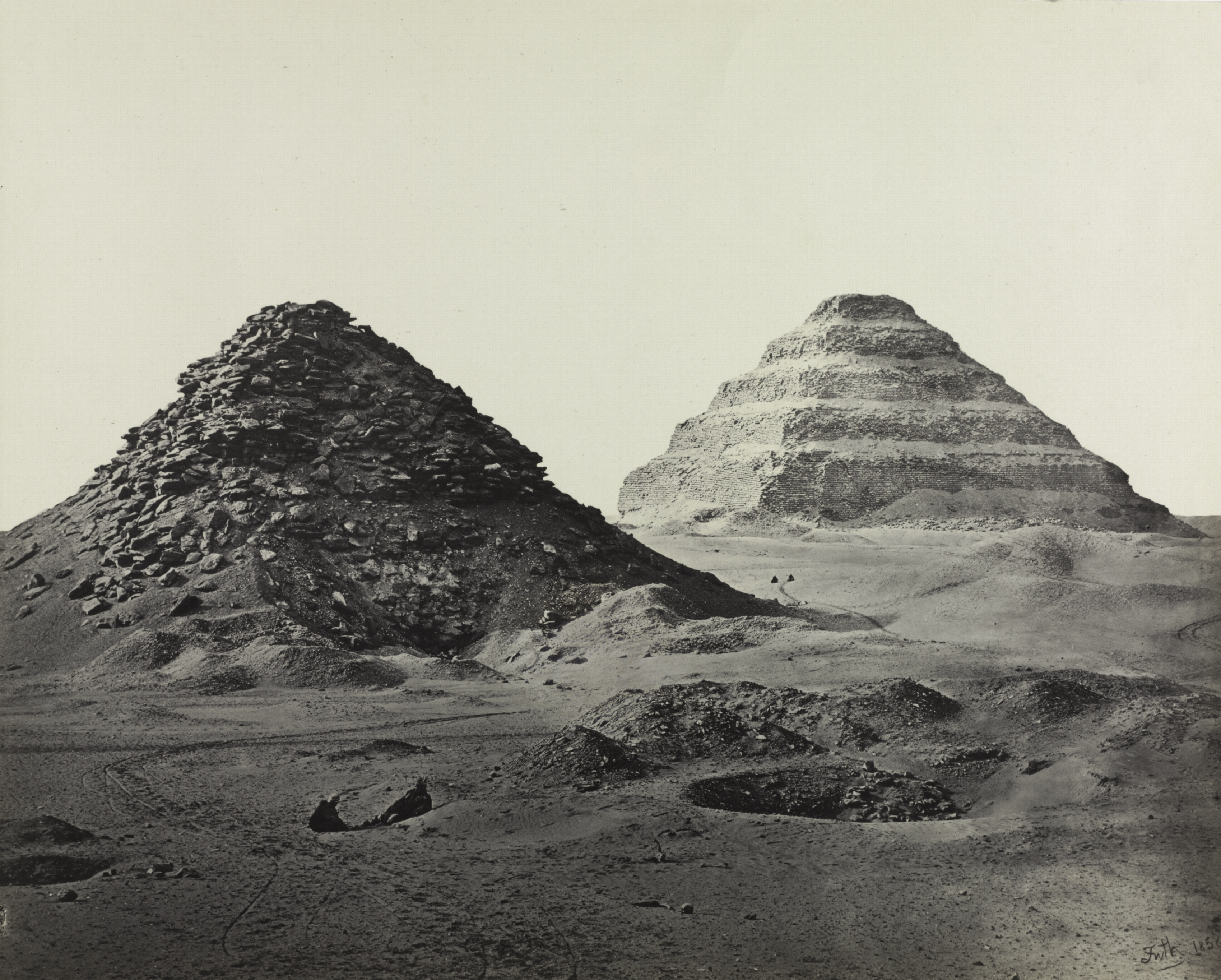 Black and white photograph of two pyramids. The pyramid on the left has a jagged exterior made of dark, uneven stones. The pyramid on the right is made of smoother, lighter-colored stone and has horizontal layers visible. Both pyramids have a triangular shape. The foreground shows a flat, sandy area with small rocks and a few depressions.