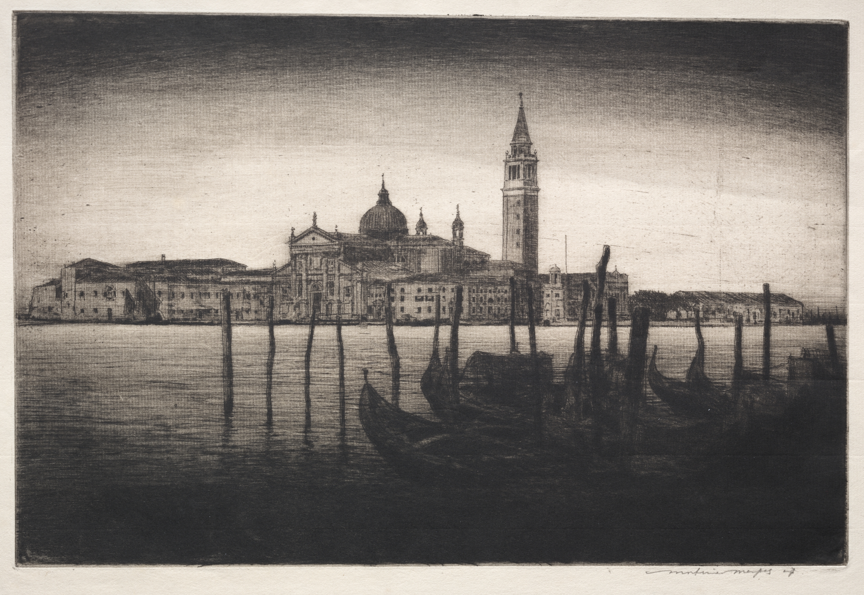 Black and white image of a city on water. Darker foreground. Several wooden poles in water. Three gondolas in foreground. Large domed building and tall tower in background. Several buildings line waterfront. Sky transitions from dark at top to light in center. Image is an etching by Mortimer Menpes titled San Giorgio Maggiore.