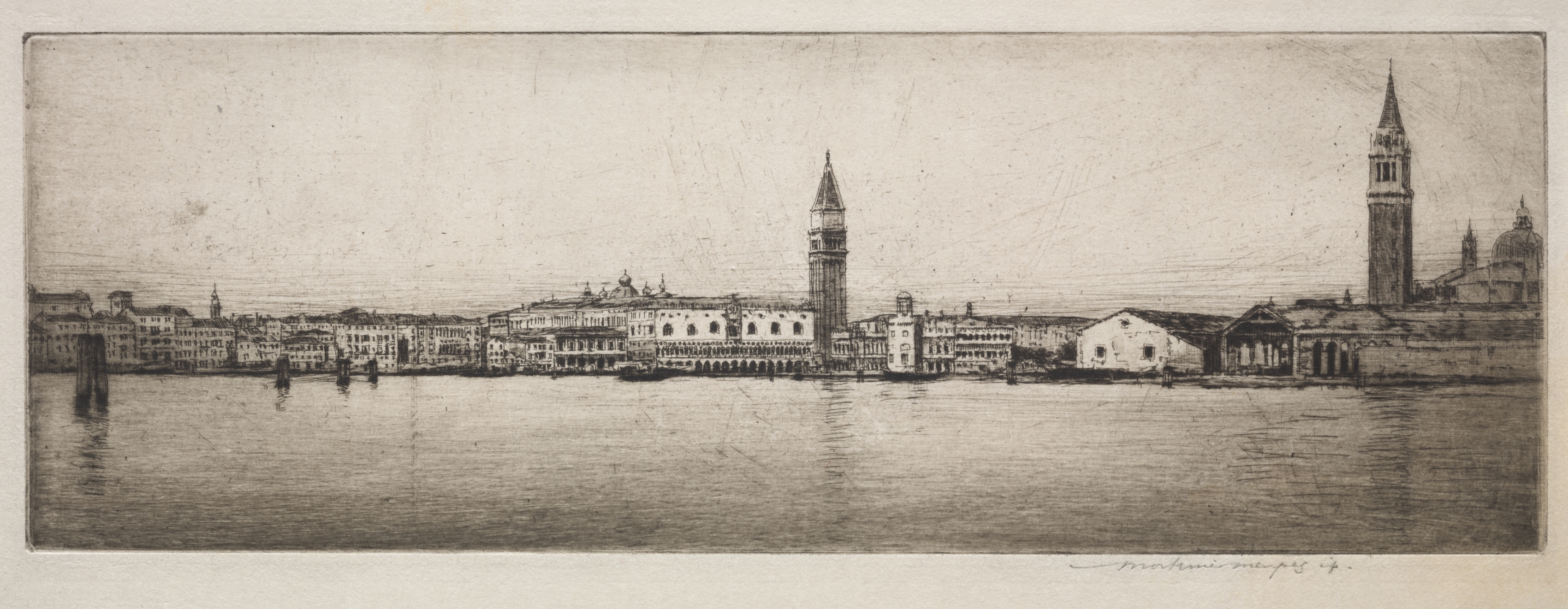 Black and white image of a body of water with buildings along the shore. The buildings vary in size and shape, with some featuring domed or pointed roofs. There are three tall towers visible on the right side. The water is calm with reflections of the buildings. The image has a border around it and the artist's signature is in the bottom right corner. The title of the work is associated with a famous location in Italy.