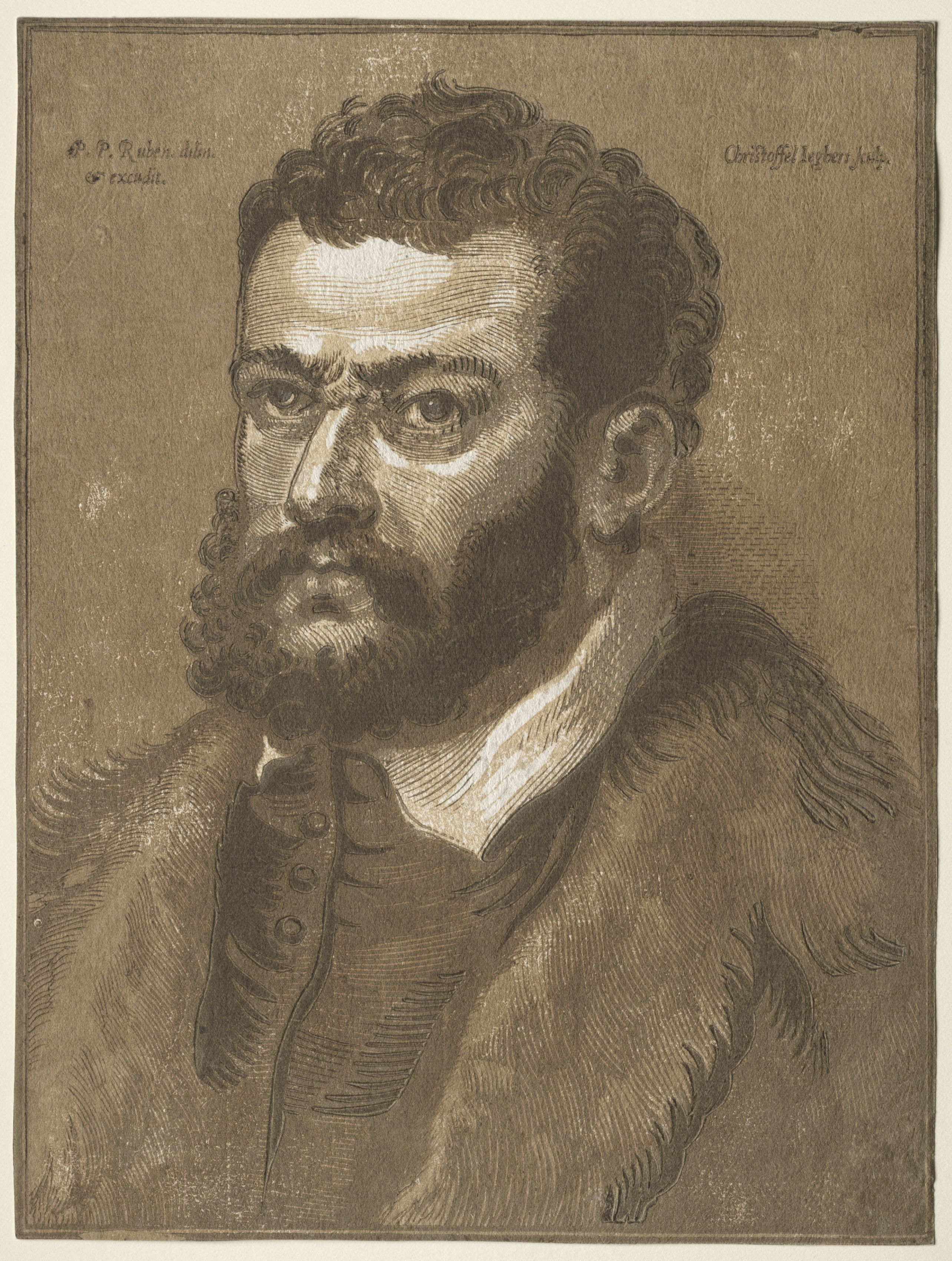A sepia-toned drawing of a man's bust, bearded man with curly hair, wearing a fur coat, looking to the left.