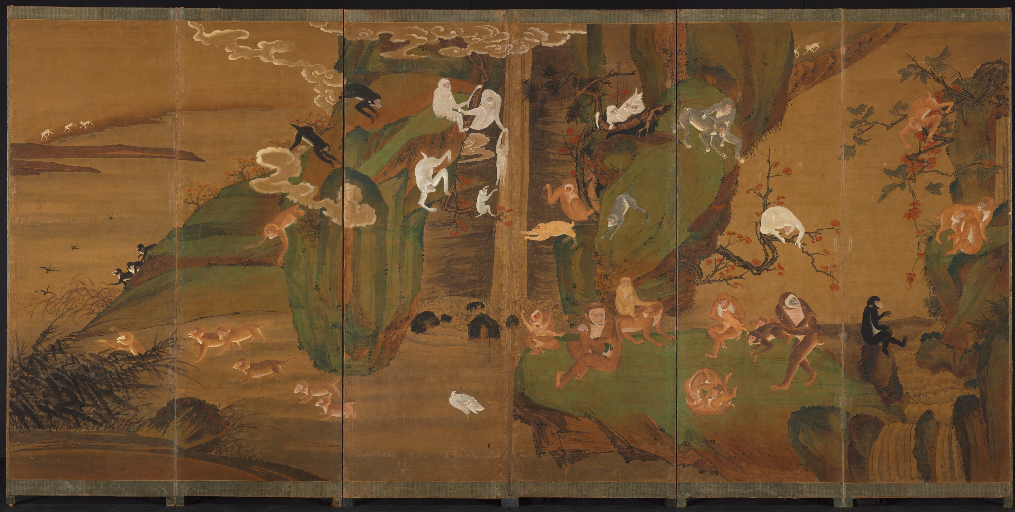 The painting "Gibbons in a Landscape" by Japanese artist Maruyama Ōkyo depicts a large group of monkeys, predominantly white, brown, and black, occupying a mountainous landscape. The painting has a background with shades of brown. The gibbons are positioned on tree branches and on the ground. Some gibbons are standing on two legs like humans, while others are on all fours. Several gibbons appear to be hanging from tree branches. The gibbons are various sizes. In the background, there are hills and a body of water with distant white animals, possibly horses. The painting also features birds flying in the air and on the ground. The image conveys dense vegetation with trees and bushes in the background.