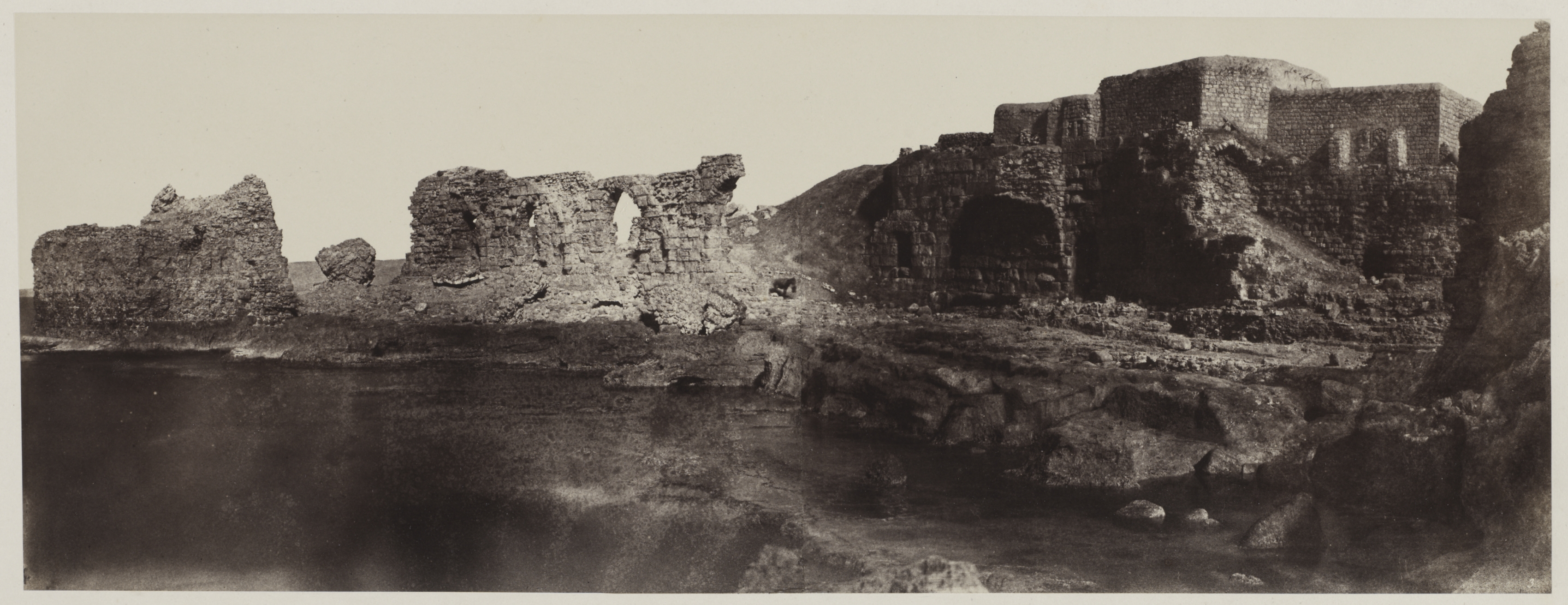 Black and white photograph of ruins next to body of water. The ruins are made of stone and have crumbling walls and archways. Some walls are missing sections. The walls are on a rocky coastline. The water is dark and appears calm. The sky is light-colored and featureless. The photograph is in a landscape orientation.