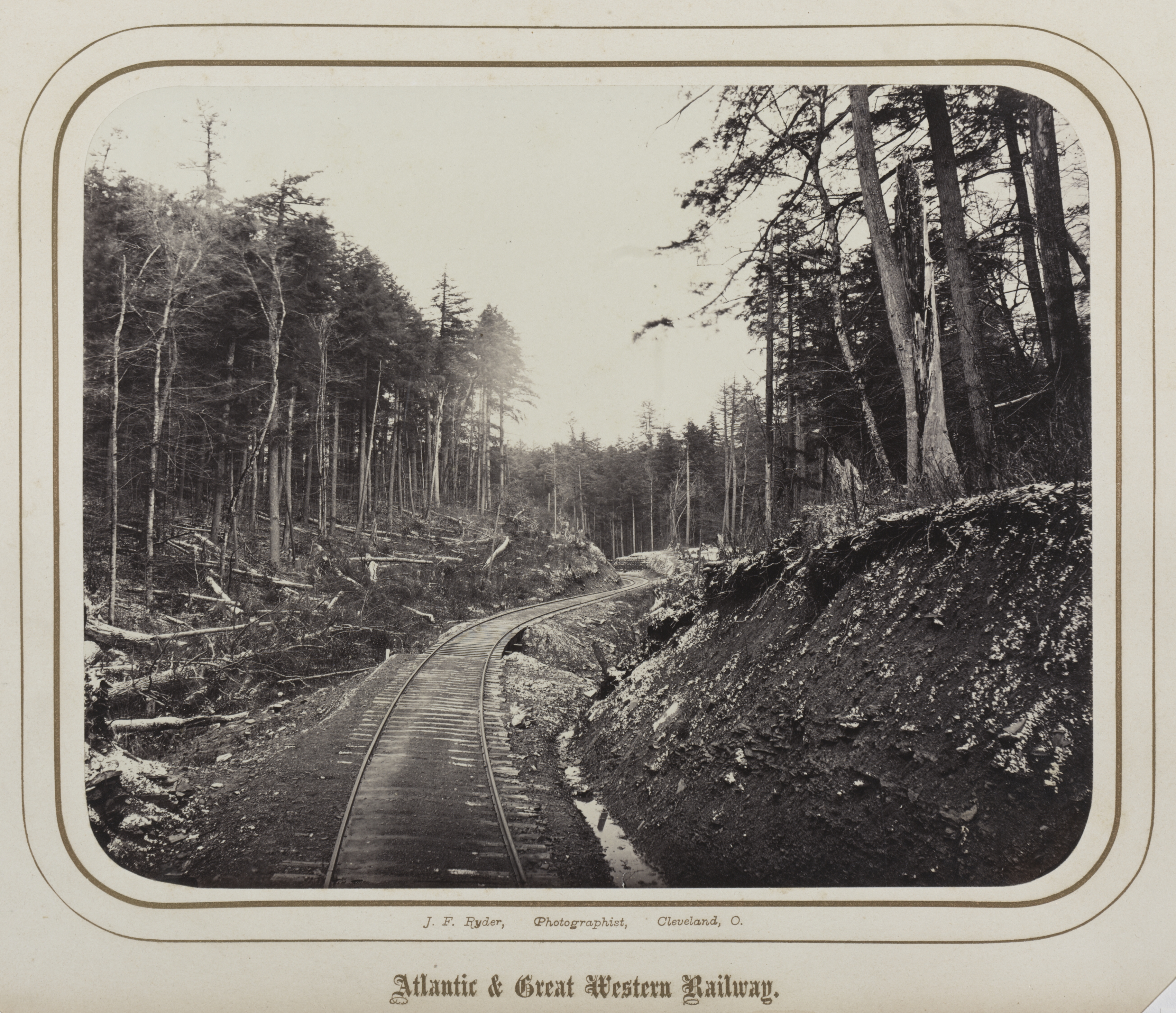 Black and white photo of railroad tracks running through a wooded area. The tracks curve to the right in the distance. The area to the right of the tracks is a dirt hill with trees on top. The area to the left of the tracks has fallen trees and branches on the ground. There are trees on both sides of the tracks. The sky is visible in the background. The photo has a rounded rectangular border with two thin lines around the image. The bottom of the border has text that reads "Atlantic & Great Western Railway". Below that, smaller text reads "J. F. Ryder, Photographer, Cleveland, O."