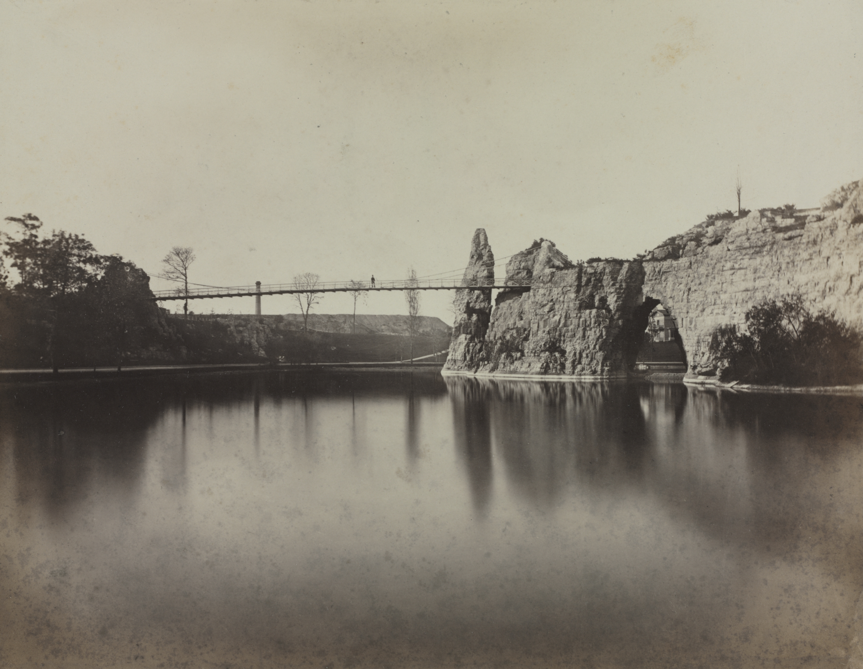 Black and white photograph of a suspension bridge over a body of water. The bridge has two visible support structures on either side. A rocky cliffside with a cave-like opening is on the right side. Trees line the water on the left. The water is calm and reflects the scene. A person is on the bridge. The sky above is light-colored.