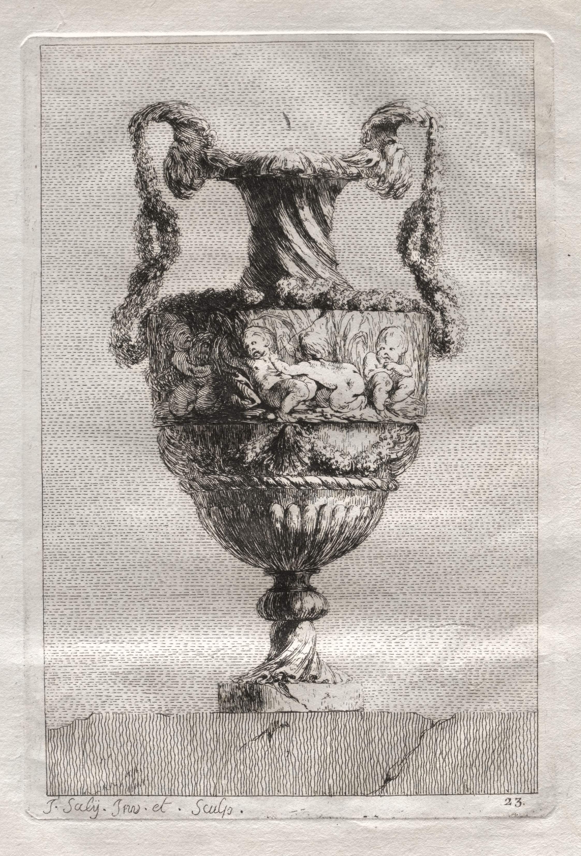 Black and white drawing of a vase. The vase has a narrow base that widens at the bottom, then tapers in and widens again at the top. The base has a twisted rope design. There are two handles on either side of the vase that are made to look like ropes. The body of the vase has a relief of three cherubs. The background is a textured surface. The number 23 appears in the bottom right corner. A signature appears in the bottom left corner.
