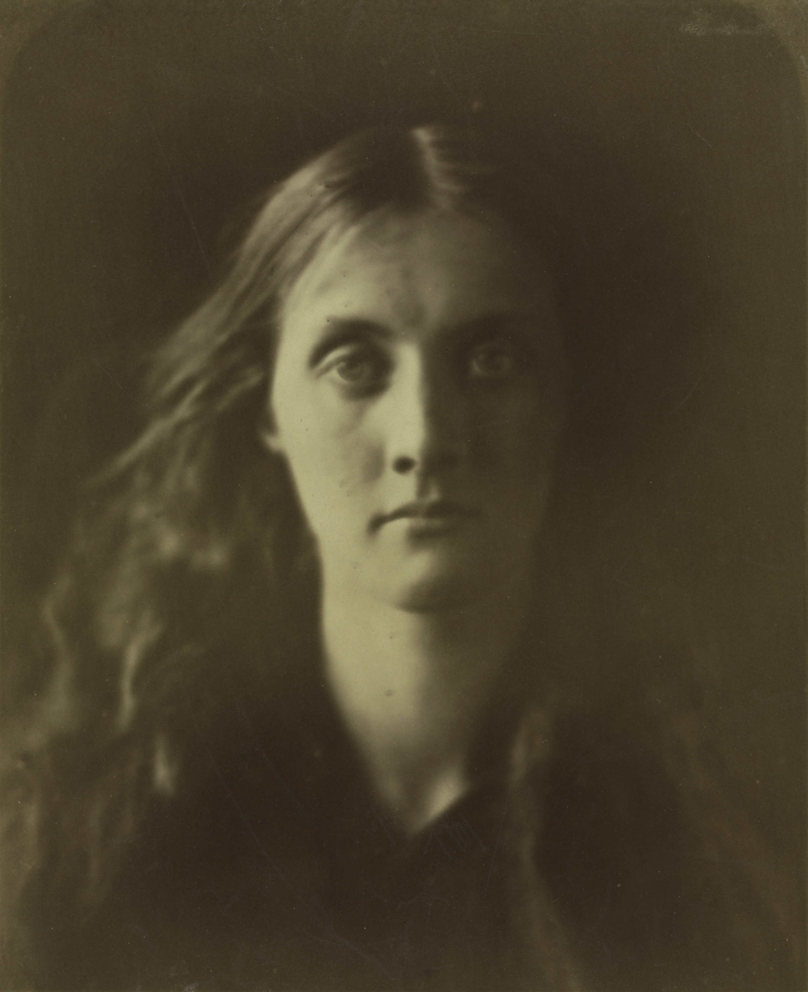Sepia-toned photograph of a woman with long hair. The woman's face is the main focus, shown from the shoulders up. She has long, wavy hair parted in the center and swept back. Her facial expression is neutral. She has dark eyes, a small nose, and thin lips. The background is dark and shadowy. The photograph has rounded corners and visible scratches or marks. Julia Jackson Duckworth, by Julia Margaret Cameron.