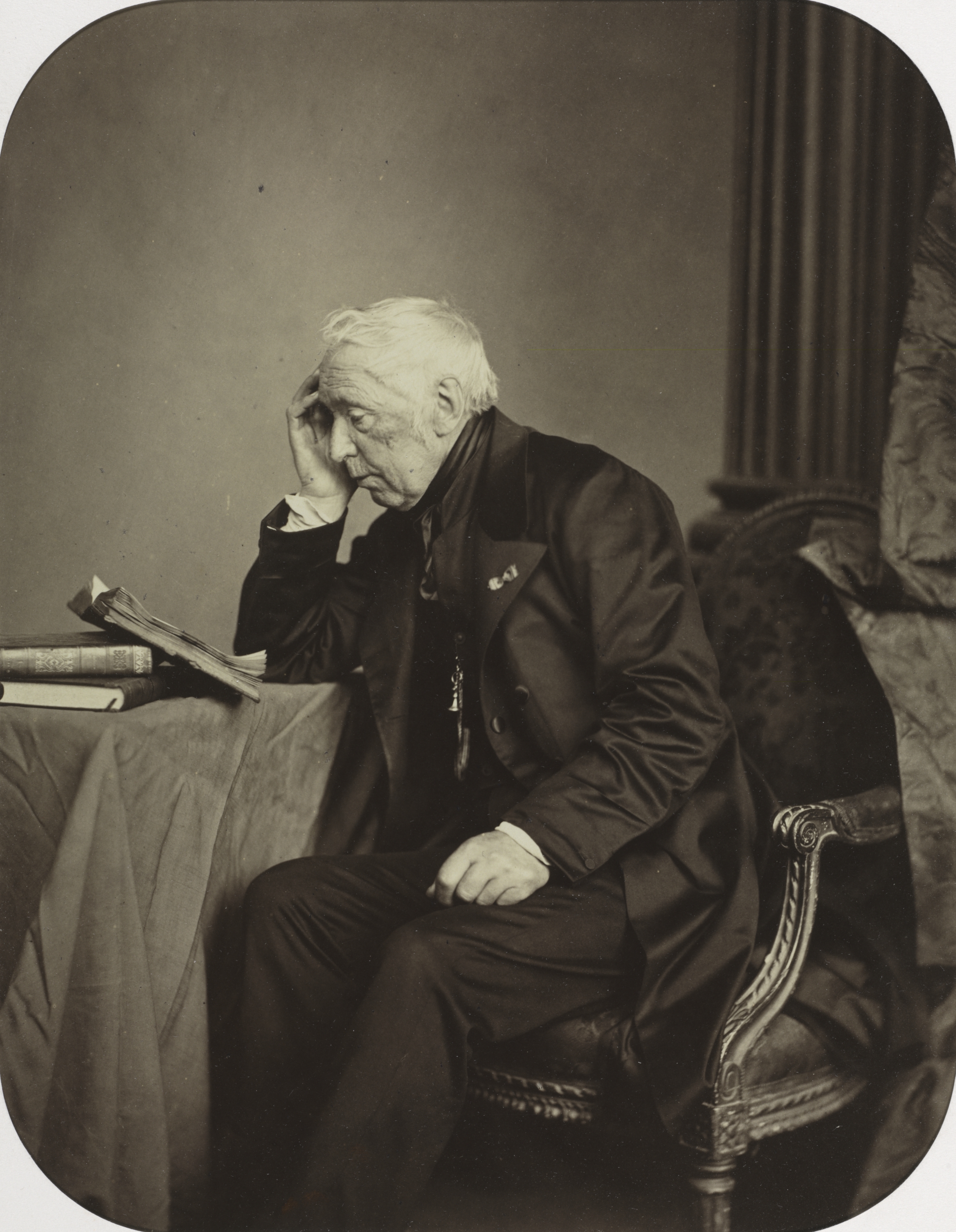Black and white photograph of an older man sitting on a chair. The man has white hair and wears a dark-colored suit with a dark shirt and a tie. His right elbow rests on a table covered with a cloth and holding an open book. His right hand supports his forehead. The chair has a carved wooden frame and upholstered seat and backrest. In the background, a curtain and a wall are visible. The photograph is titled "Unknown Male Sitter" and is by Antoine-Samuel Adam-Salomon.