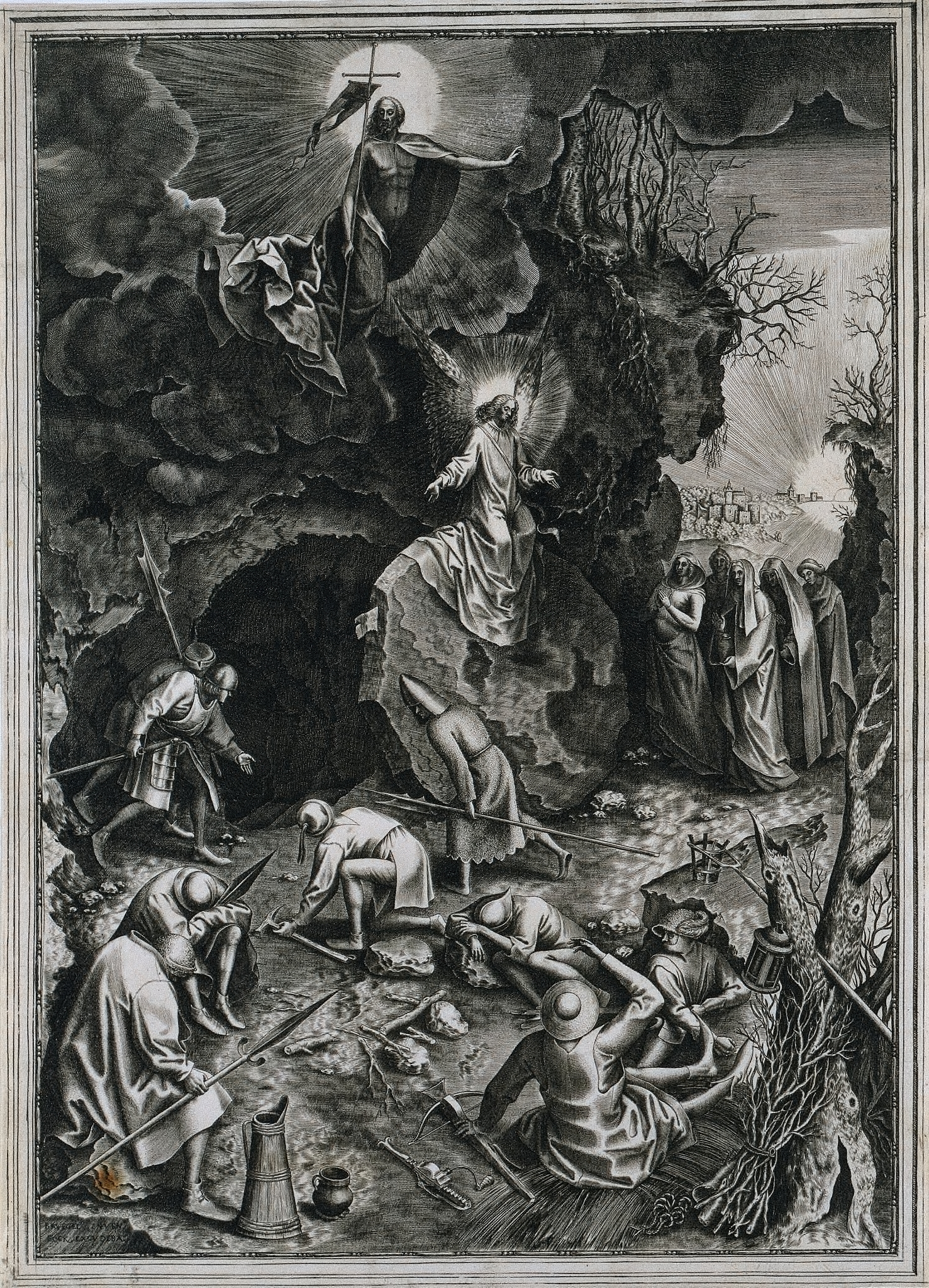 Black and white image of a man rising from a cave. The man rising has long hair and a long cloth wrapped around his body. A crucifix is visible behind his head. He has his arms outstretched. He is surrounded by a halo of light. The cave entrance is behind him. Six men kneel and stand at the bottom of the image with spears and shovels. A few objects lie on the ground near them. Five people stand on the right side, wrapped in long clothing. A city is on the horizon on the right side. Dark clouds are on the left. Barren trees are on the right.