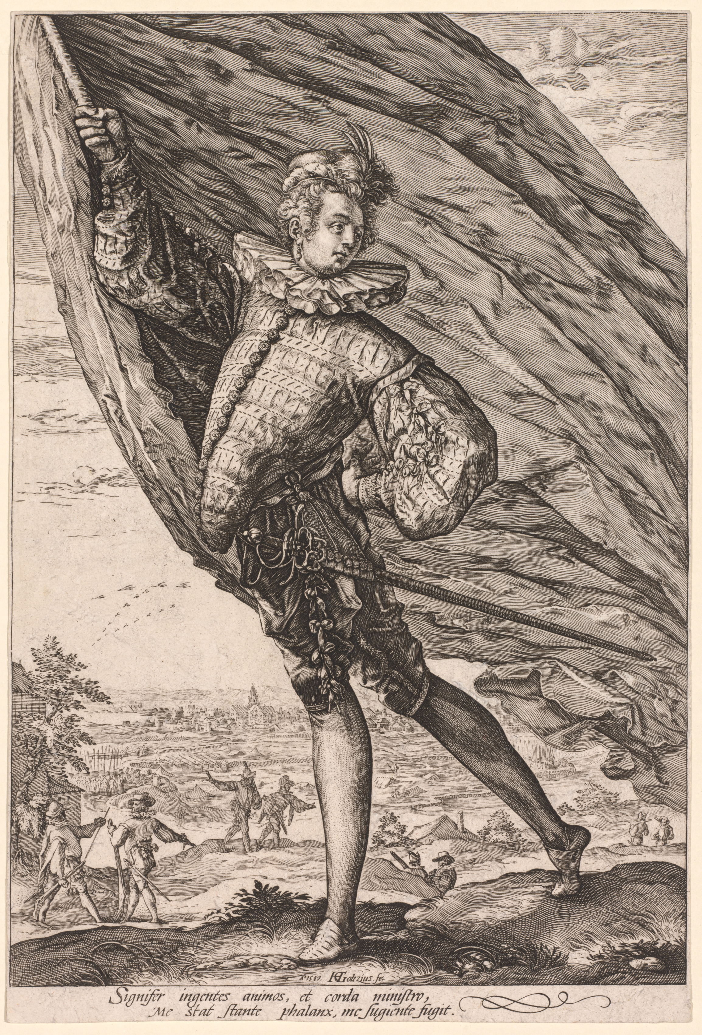Black and white image, man wearing ornate clothing from the 16th or 17th century, holding a large flag or banner with one hand, curly hair, ruffled collar, ornate doublet with buttons, short pants, hose, and no shoes. Man standing on one leg, other leg extended behind him. Background shows a landscape with trees, buildings, and people.