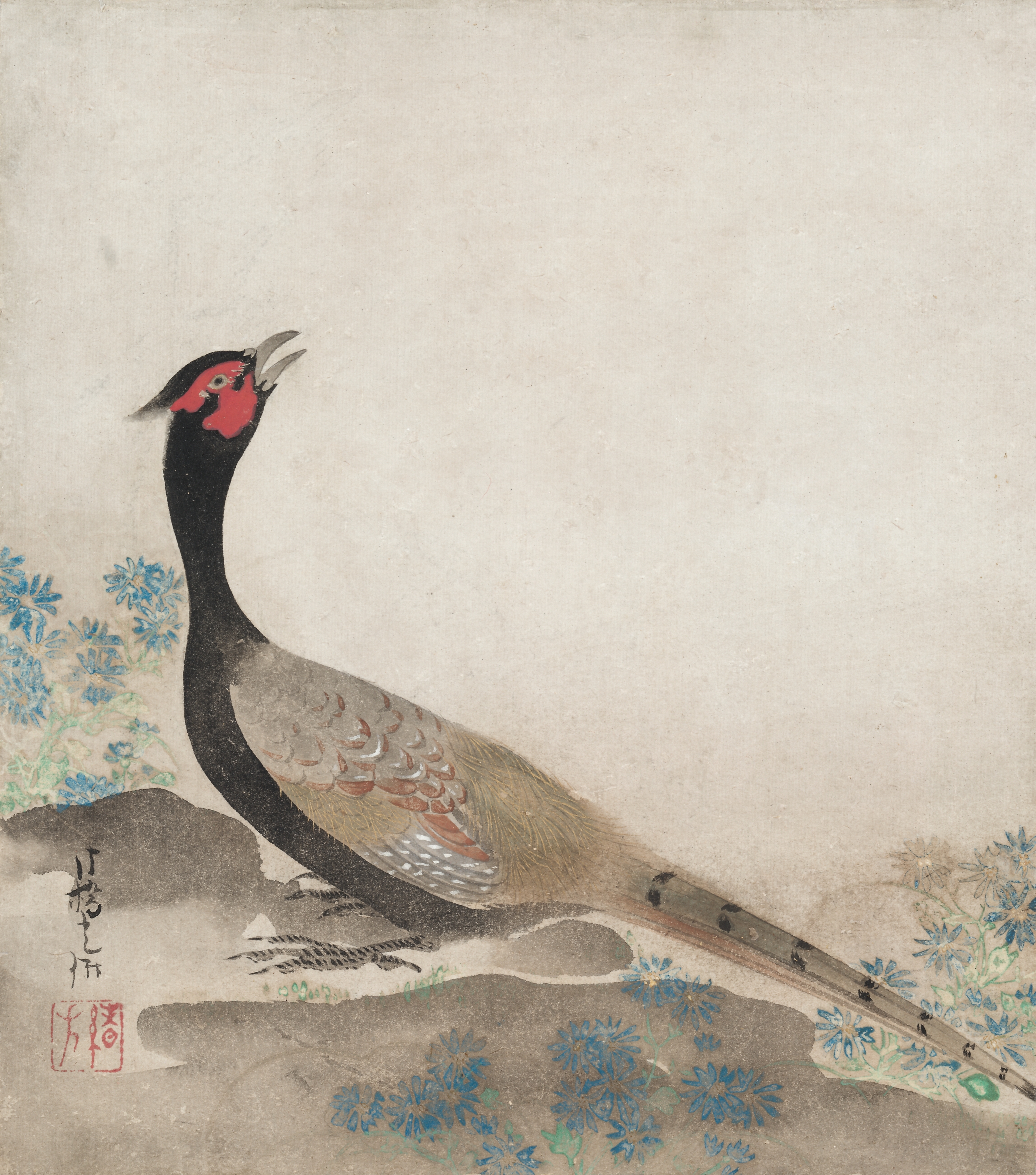 The image depicts a pheasant standing on a rock, surrounded by blue flowers. The bird has a black neck, red face, and grayish-brown body with brown and white feathers on its wing. Its long tail feathers are brown with black spots. The bird's beak is open as if it is calling out. The background of the image is a light beige color, with some darker spots and marks that give it a textured appearance. There are also some blue flowers painted around the base of the rock, adding a pop of color to the scene. In the bottom-left corner, there is a signature written in black ink, accompanied by a red seal. The overall style of the painting is traditional Japanese, with bold lines and vibrant colors. The artist's use of color and composition creates a sense of balance and harmony in the image. Pheasant by Ogata Kōrin.