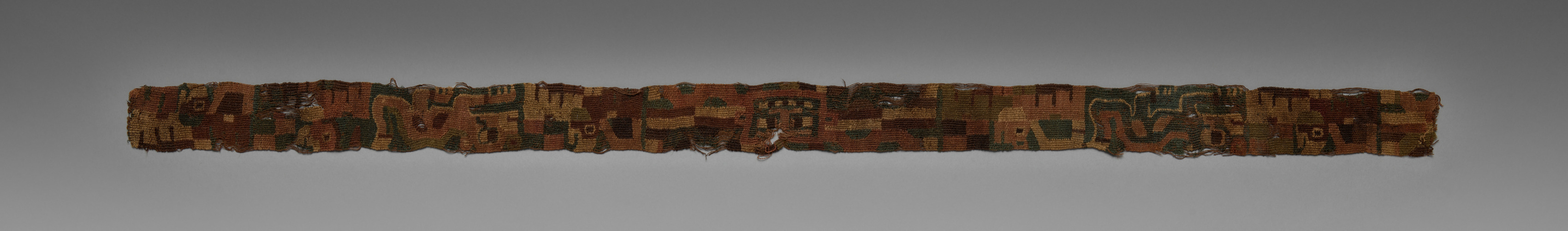 The Fragment of a Belt by Unknown is a long, narrow, rectangular textile with a frayed edge on both sides. The belt features a patchwork design composed of various small, rectangular pieces of fabric sewn together in a random pattern. The fabric pieces display a range of earthy tones, including shades of brown, beige, and green, with some featuring darker designs or patterns. The background of the image is a gradient that transitions from dark gray at the top to light gray at the bottom.