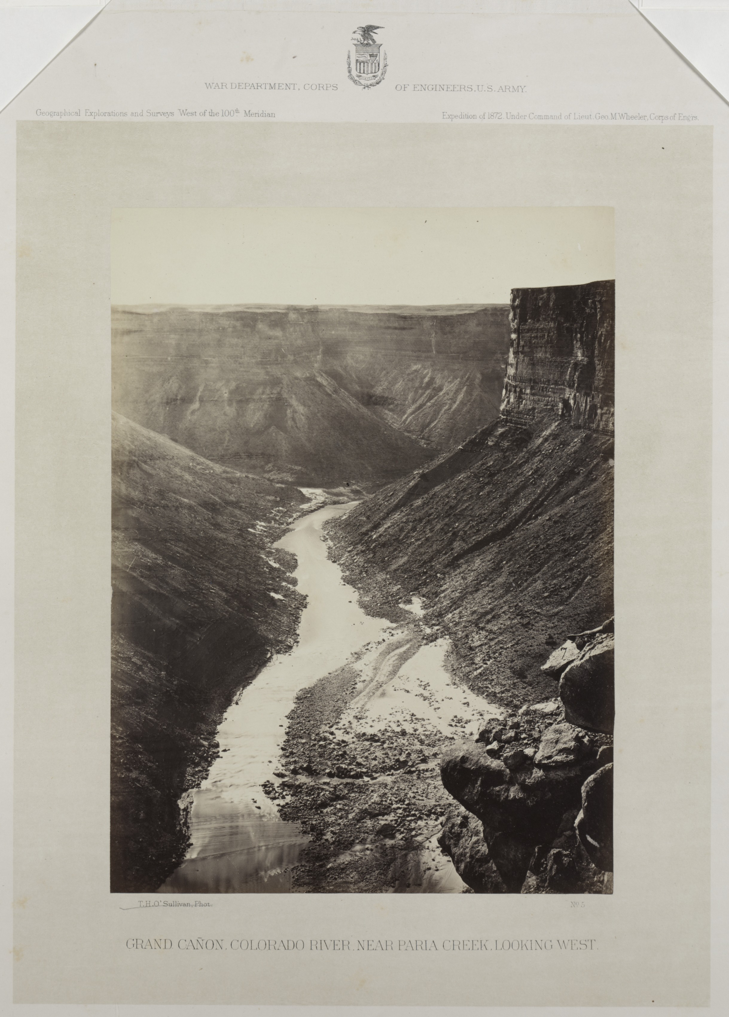 Black and white photograph of a river flowing through a canyon. The river is in the center. It has a light-colored sandy area and is bordered by rocks. The river curves from the bottom center to the middle top. The canyon walls are steep and rocky, with some vegetation visible on the sides. The background shows more canyon and a flat horizon. The photograph is mounted on a beige background with text at the top and bottom. The photograph is a landscape orientation.