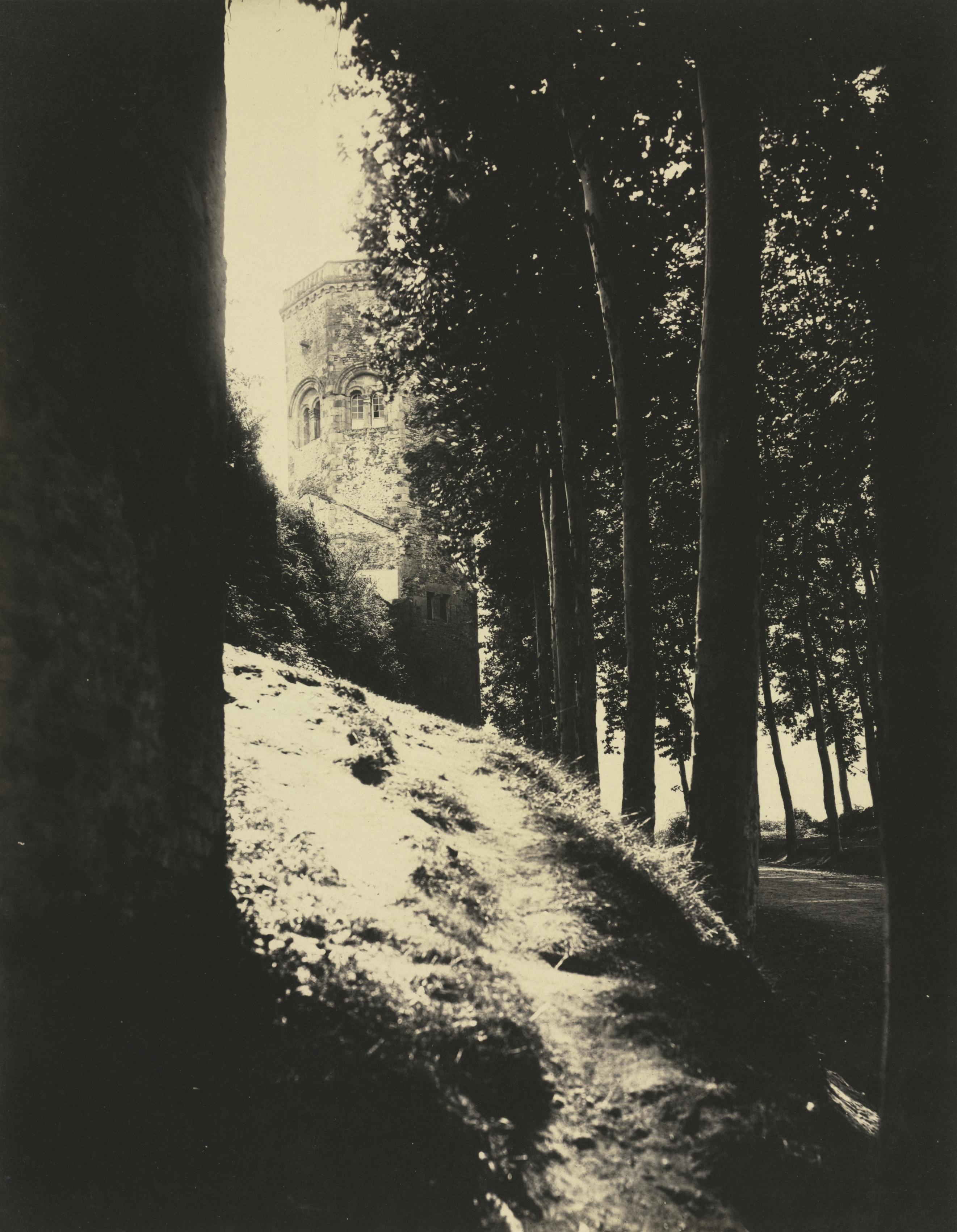 Black and white photo of a path surrounded by trees on the right and a large tree trunk on the left. The path is a continuation of a small hill on the left. The path leads to a tower in the background, partially obscured by trees. The tower is made of stone and has three visible arched windows. The top of the tower appears to have a flat edge. The sky is visible in the top left corner. The trees on the right side of the path have leaves. The image has a sepia tone. The tower is titled "Autun, Tower of Ursulines" and attributed to Charles Lenormand.