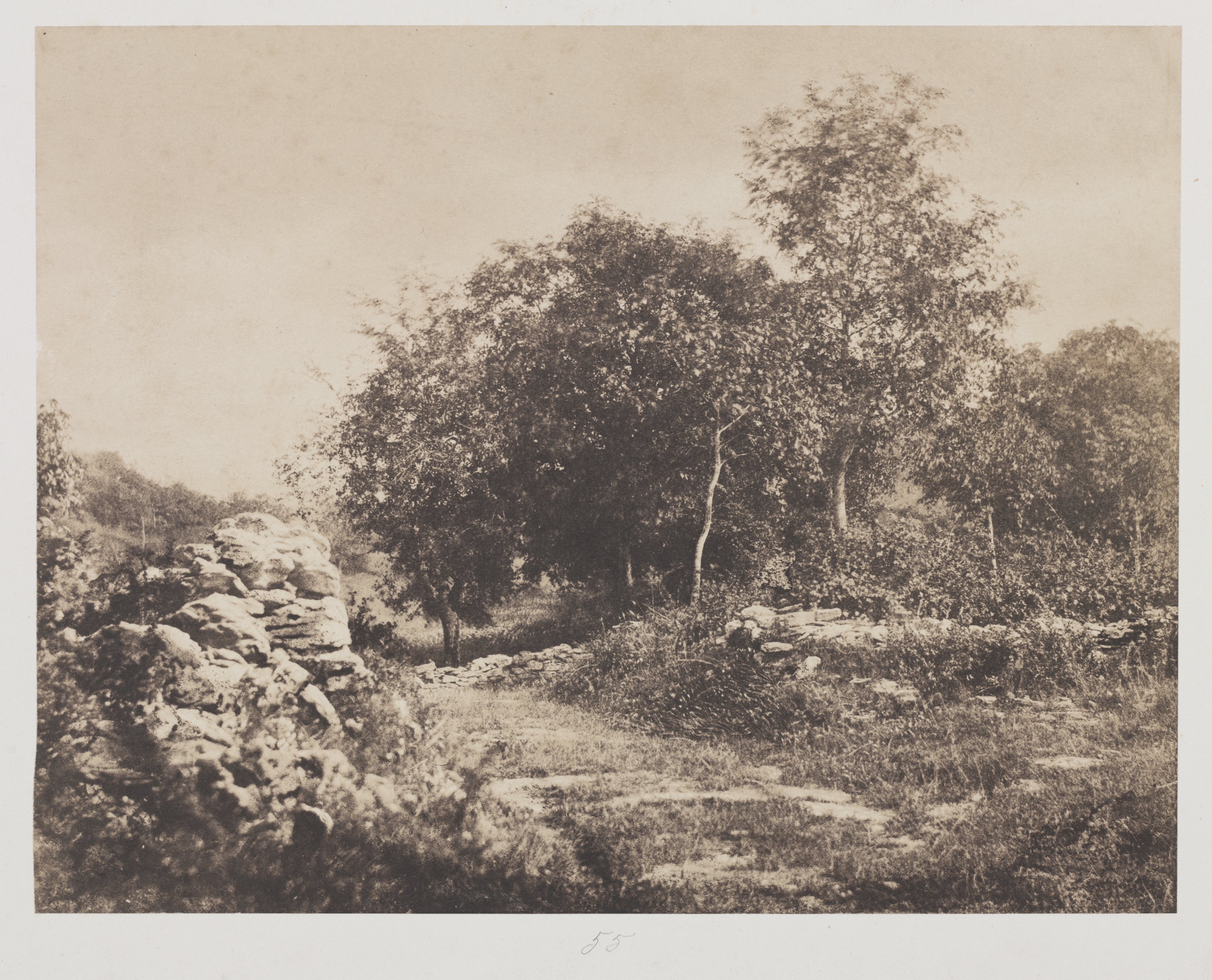 Black and white photograph of a landscape with trees and a stone wall. A dirt path with grass on either side leads to a group of trees. A low stone wall on the right runs parallel to the path. A taller stack of stones on the left. Trees and bushes line the background. The sky is visible at the top.