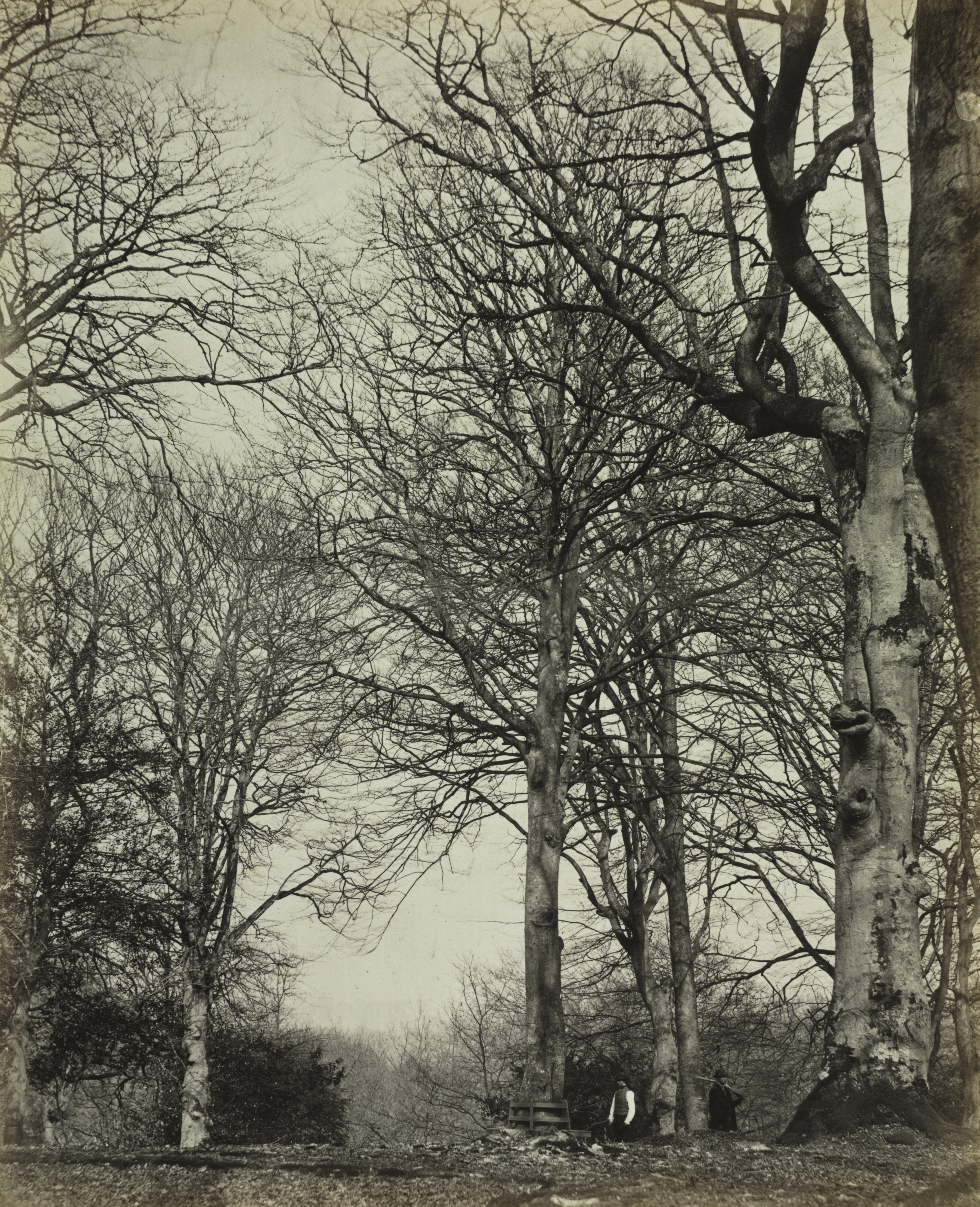 Black and white photo of bare trees with two people standing near the base. The trees are tall with thick trunks and no leaves. The two people are wearing old-fashioned clothing and appear to be standing on grass. A small wooden barrel sits on the ground near the trees. The background features more trees and a light-colored sky.