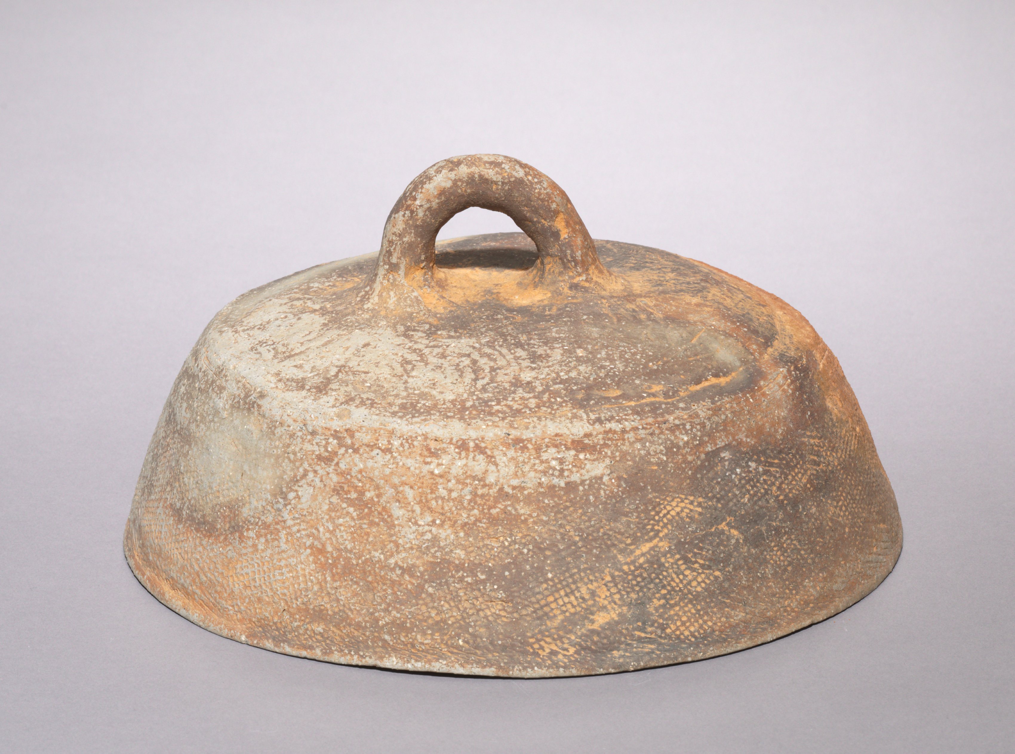 Brown ceramic lid with loop handle on top, featuring an overall impressed surface decoration. The lid is domed in shape with a rounded handle protruding from the top. The surface exhibits a predominantly brown coloration with patches of lighter and darker shades. The background of the image is gray.